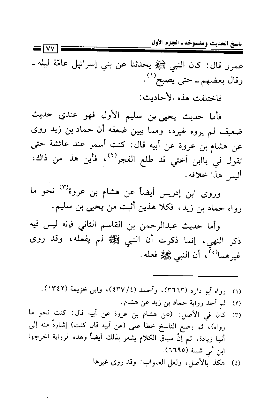 فأما حديث يحيى بن سليم الأول فهو عندي حديث ضعيف لم يروه غيره، ومما يبين ضعفه أن حماد بن زيد روى عن هشام بن عروة عن أبيه قال: كنت أسمر عند عائشة حتى تقول لي يا ابن أختي قد