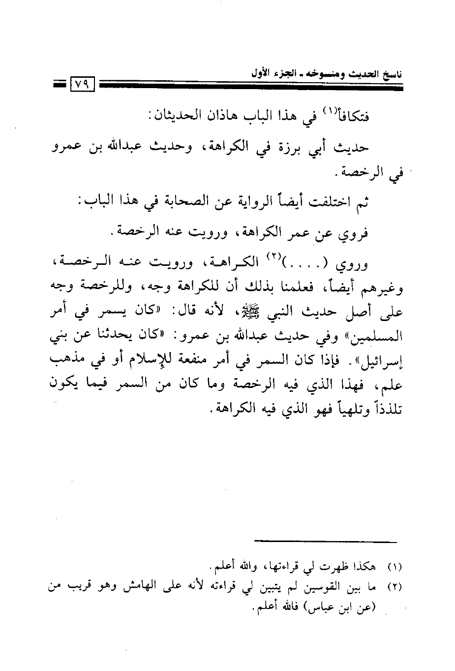 وروي ( .. ... ) الكراهة، ورويت عنه الرخصة، وغيرهم أيضاً، فعلمنا بذلك أن للكراهة وجهاً، وللرخصة وجه على أصل حديث النبي صلى الله عليه وسلم، لأنه قال: ((كان يسمر في أمر المسلمين)) وفي حديث عبد الله بن عمرو: ((كان يحدثنا عن بني إسرائيل)). فإذا كان السمر في أمر منفعة للإسلام أو في مذهب علم، فهذا الذي فيه الرخصة وما كان من السمر فيما يكون تلذذاً وتلهياً فهو الذي فيه الكراهة.