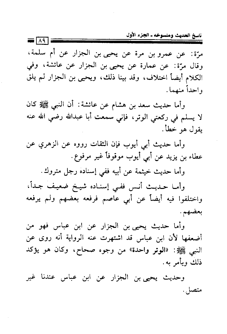 وأما حديث يحيى بن الجزار عن ابن عباس فهو من أضعفها لأن ابن عباس قد اشتهرت عنه الرواية أنه روى عن النبي صلى الله عليه وسلم: ((الوتر واحدة)) من وجوه صحاح، وكان هو يؤكد ذلك ويأمر به.