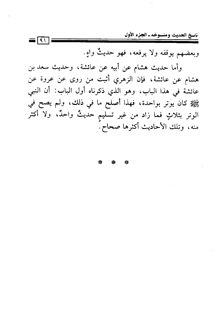وأما حديث هشام عن أبيه عن عائشة، وحديث سعد بن هشام عن عائشة، فإن الزهري أثبت من روى عن عروة عن عائشة في هذا الباب، وهو الذي ذكرناه أول الباب: أن النبي صلى الله عليه وسلم كان يوتر بواحدة، فهذا أصلح ما في ذلك، ولم يصح في الوتر بثلاثٍ فما زاد من غير تسليمٍ حديثٌ واحدٌ، ولا أكثر منه، وتلك الأحاديث أكثرها صحاح.