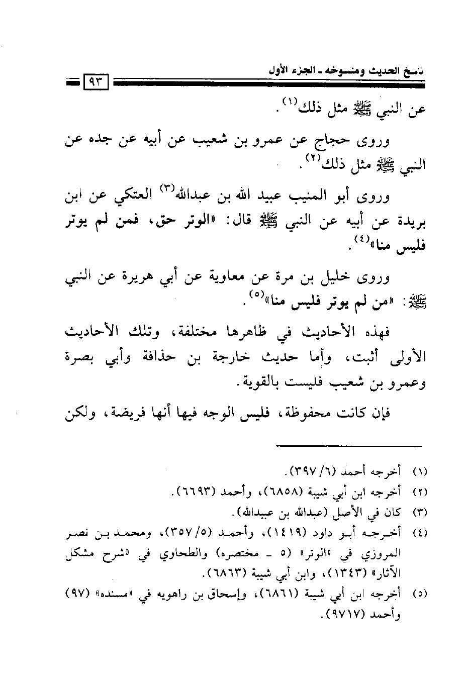 وروى أبو المنيب عبيد الله بن عبد الله العتكي عن ابن بريدة عن أبيه عن النبي صلى الله عليه وسلم قال: ((الوتر حق، فمن لم يوتر فليس منا)).