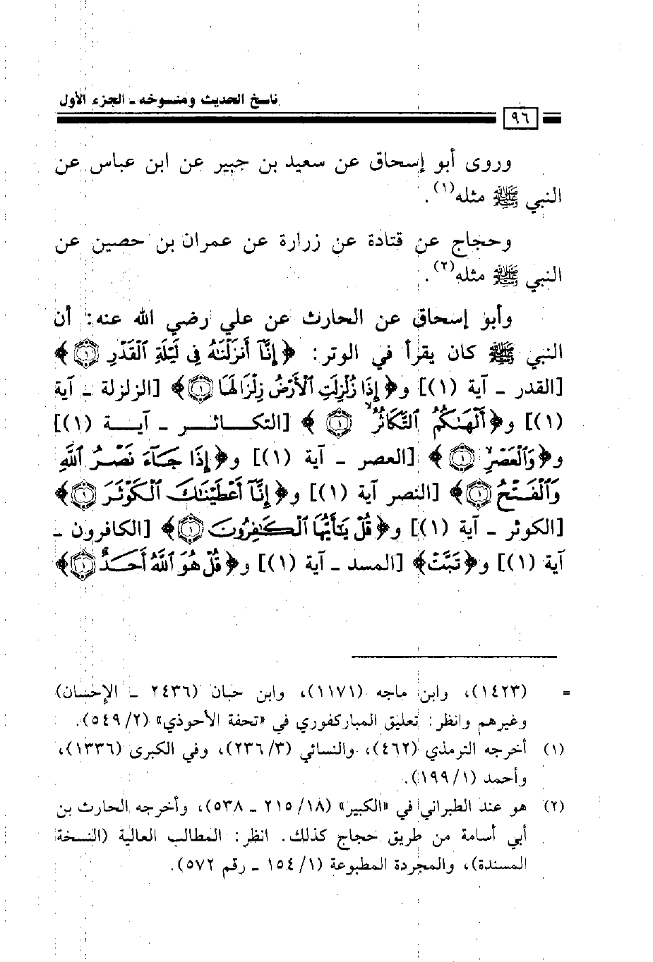 وأبو إسحاق عن الحارث عن علي رضي الله عنه: أن النبي صلى الله عليه وسلم كان يقرأ في الوتر: {إنا أنزلناه في ليلة القدر} و {إذا زلزلت الأرض زلزالها} و {ألهاكم التكاثر} و {والعصر} و {إذا جاء نصر الله والفتح} و {إنا أعطيناك الكوثر} و {قل يا أيها الكافرون} و {تبت} و {قل هو الله أحد}.