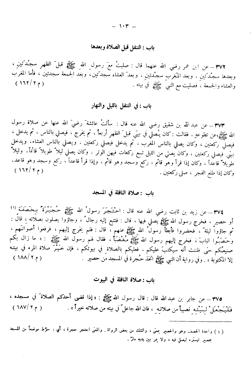 373 - عَنْ عَبْدِ اللهِ بْنِ شَقِيقٍ - رضي الله عنه - قَالَ سَأَلْتُ عَائِشَةَ - رضي الله عنها - عَنْ صَلَاةِ رَسُولِ اللهِ - صَلَّى اللهُ عَلَيْهِ وَسَلَّمَ - عَنْ تَطَوُّعِهِ فَقَالَتْ كَانَ يُصَلِّي في بَيْتِي قَبْلَ الظُّهْرِ أَرْبَعًا ثُمَّ يَخْرُجُ فَيُصَلِّي بِالنَّاسِ ثُمَّ يدخلُ فَيُصَلِّي رَكْعَتَيْنِ وَكَانَ يُصَلِّي بِالنَّاسِ الْمَغْرِبَ ثُمَّ يدخلُ فَيُصَلِّي رَكْعَتَيْنِ وَيُصَلِّي بِالنَّاسِ الْعِشَاءَ وَيَدْخُلُ بَيْتِي فَيُصَلِّي رَكْعَتَيْنِ وَكَانَ يُصَلِّي مِنْ اللَّيْلِ تِسْعَ رَكَعَاتٍ فِيهِنَّ الْوِتْرُ وَكَانَ يُصَلِّي لَيْلًا طَوِيلًا قَائِمًا وَلَيْلًا طَوِيلًا قَاعِدًا وَكَانَ إِذَا قَرَأَ وَهُوَ قَائِمٌ رَكَعَ وَسَجَدَ وَهُوَ قَائِمٌ وَإِذَا قَرَأَ قَاعِدًا رَكَعَ وَسَجَدَ وَهُوَ قَاعِدٌ وَكَانَ إِذَا طَلَعَ الْفَجْرُ صَلَّى رَكْعَتَيْنِ. (م 2/ 162)