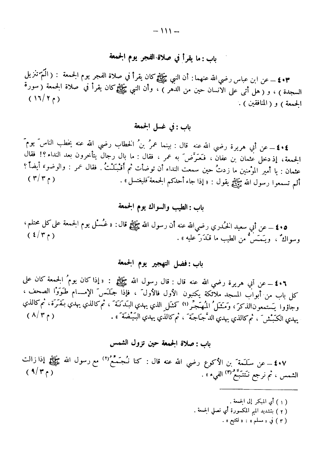 403 - عَنْ ابْنِ عَبَّاسٍ - رضي الله عنهما - أَنَّ النَّبِيَّ - صَلَّى اللهُ عَلَيْهِ وَسَلَّمَ - كَانَ يَقْرَأُ في صَلَاةِ الْفَجْرِ يَوْمَ الْجُمُعَةِ (الم تنزيل السجدة) و (هَلْ أَتَى عَلَى الْإِنْسَانِ حِينٌ مِنْ الدَّهْرِ) وَأَنَّ النَّبِيَّ - صَلَّى اللهُ عَلَيْهِ وَسَلَّمَ - كَانَ يَقْرَأُ في صَلَاةِ الْجُمُعَةِ سُورَةَ الْجُمُعَةِ وَالْمُنَافِقِينَ. (م 2/ 16)
