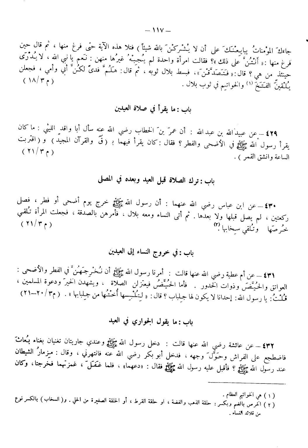 431 - عَنْ أُمِّ عَطِيَّةَ - رضي الله عنها - قَالَتْ أَمَرَنَا رَسُولُ اللهِ - صَلَّى اللهُ عَلَيْهِ وَسَلَّمَ - أَنْ نُخْرِجَهُنَّ في الْفِطْرِ وَالْأَضْحَى الْعَوَاتِقَ وَالْحُيَّضَ وَذَوَاتِ الْخُدُورِ فَأَمَّا الْحُيَّضُ فَيَعْتَزِلْنَ الصَّلَاةَ وَيَشْهَدْنَ الْخَيْرَ وَدَعْوَةَ الْمُسْلِمِينَ قُلْتُ يَا رَسُولَ اللهِ إِحْدَانَا لَا يَكُونُ لَهَا جِلْبَابٌ قَالَ لِتُلْبِسْهَا أُخْتُهَا مِنْ جِلْبَابِهَا. (م 3/ 20 - 21)