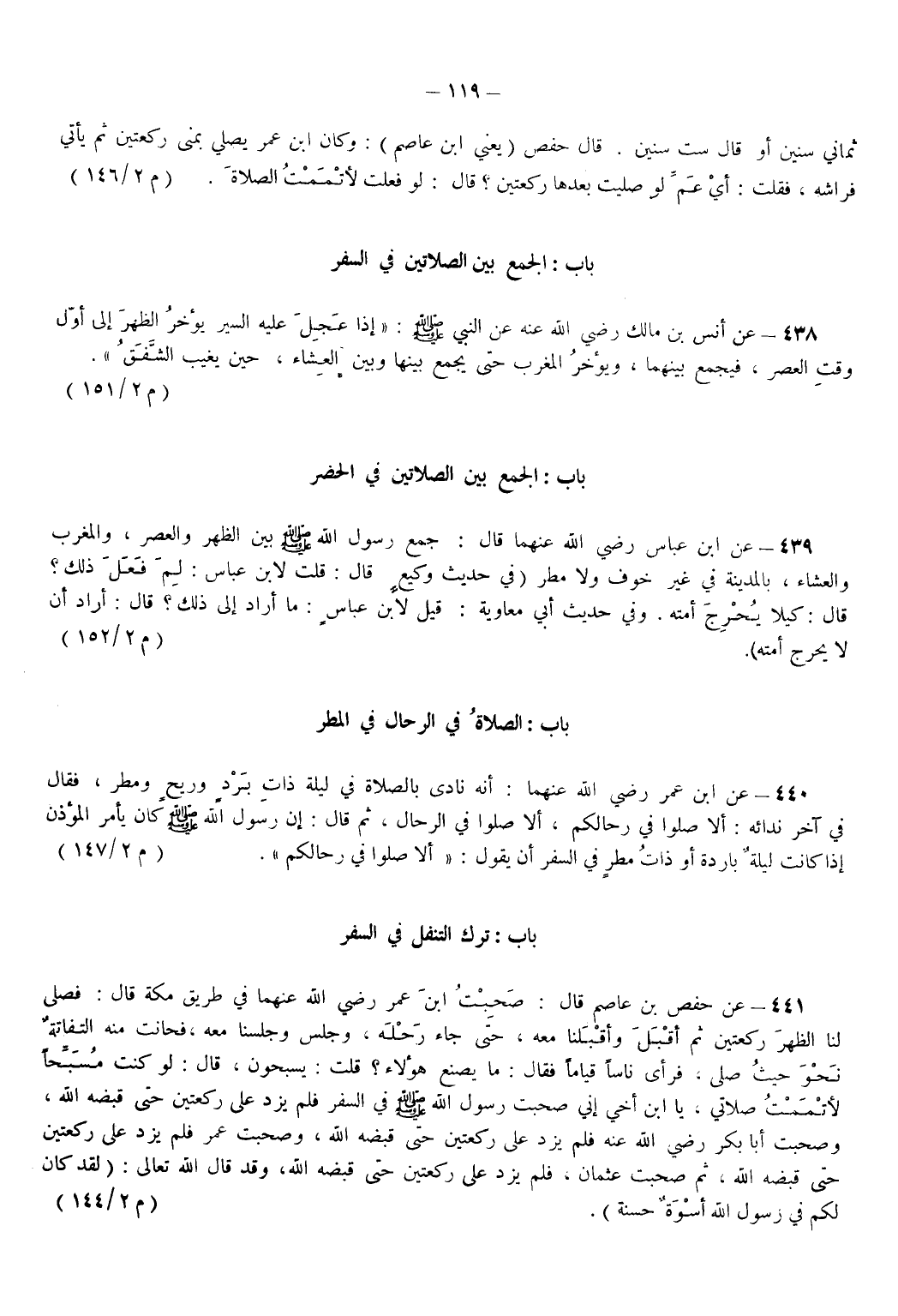 441 - عن حَفْصِ بْنِ عَاصِمِ قَالَ صَحِبْتُ ابْنَ عُمَرَ - رضي الله عنهما - في طَرِيقِ مَكَّةَ قَالَ فَصَلَّى لَنَا الظُّهْرَ رَكْعَتَيْنِ ثُمَّ أَقْبَلَ وَأَقْبَلْنَا مَعَهُ حَتَّى جَاءَ رَحْلَهُ وَجَلَسَ وَجَلَسْنَا مَعَهُ فَحَانَتْ مِنْهُ الْتِفَاتَةٌ نَحْوَ حَيْثُ صَلَّى فَرَأَى نَاسًا قِيَامًا فَقَالَ مَا يَصْنَعُ هَؤُلَاءِ قُلْتُ يُسَبِّحُونَ قَالَ لَوْ كُنْتُ مُسَبِّحًا لَأَتْمَمْتُ صَلَاتِي يَا ابْنَ أَخِي إِنِّي صَحِبْتُ رَسُولَ اللهِ - صَلَّى اللهُ عَلَيْهِ وَسَلَّمَ - في السَّفَرِ فَلَمْ يَزِدْ عَلَى رَكْعَتَيْنِ حَتَّى قَبَضَهُ اللهُ وَصَحِبْتُ أَبَا بَكْرٍ - رضي الله عنه - فَلَمْ يَزِدْ عَلَى رَكْعَتَيْنِ حَتَّى قَبَضَهُ اللهُ وَصَحِبْتُ عُمَرَ فَلَمْ يَزِدْ عَلَى رَكْعَتَيْنِ حَتَّى قَبَضَهُ اللهُ ثُمَّ صَحِبْتُ عُثْمَانَ فَلَمْ يَزِدْ عَلَى رَكْعَتَيْنِ حَتَّى قَبَضَهُ اللهُ وَقَدْ قَالَ اللهُ تعالى (لَقَدْ كَانَ لَكُمْ في رَسُولِ اللهِ أُسْوَةٌ حَسَنَةٌ). (م 2/ 144)