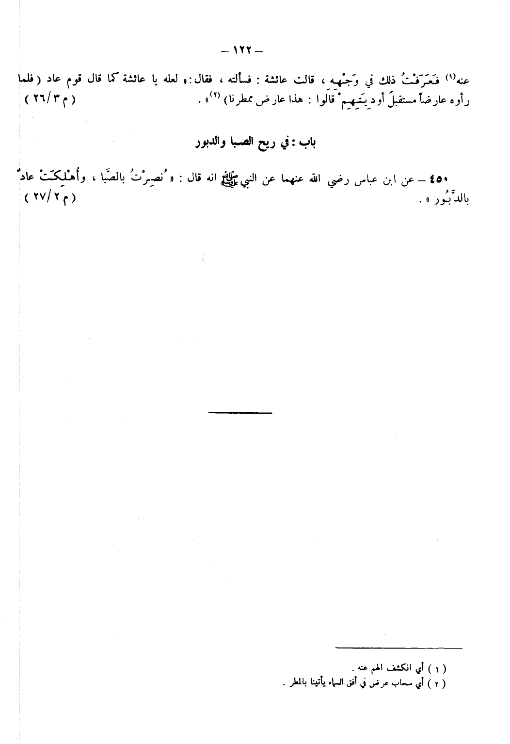 450 - عَنْ ابْنِ عَبَّاسٍ - رضي الله عنهما - عَنْ النَّبِيِّ - صَلَّى اللهُ عَلَيْهِ وَسَلَّمَ - أَنَّهُ قَالَ نُصِرْتُ بِالصَّبَا وَأُهْلِكَتْ عَادٌ بِالدَّبُورِ. (م 2/ 27)