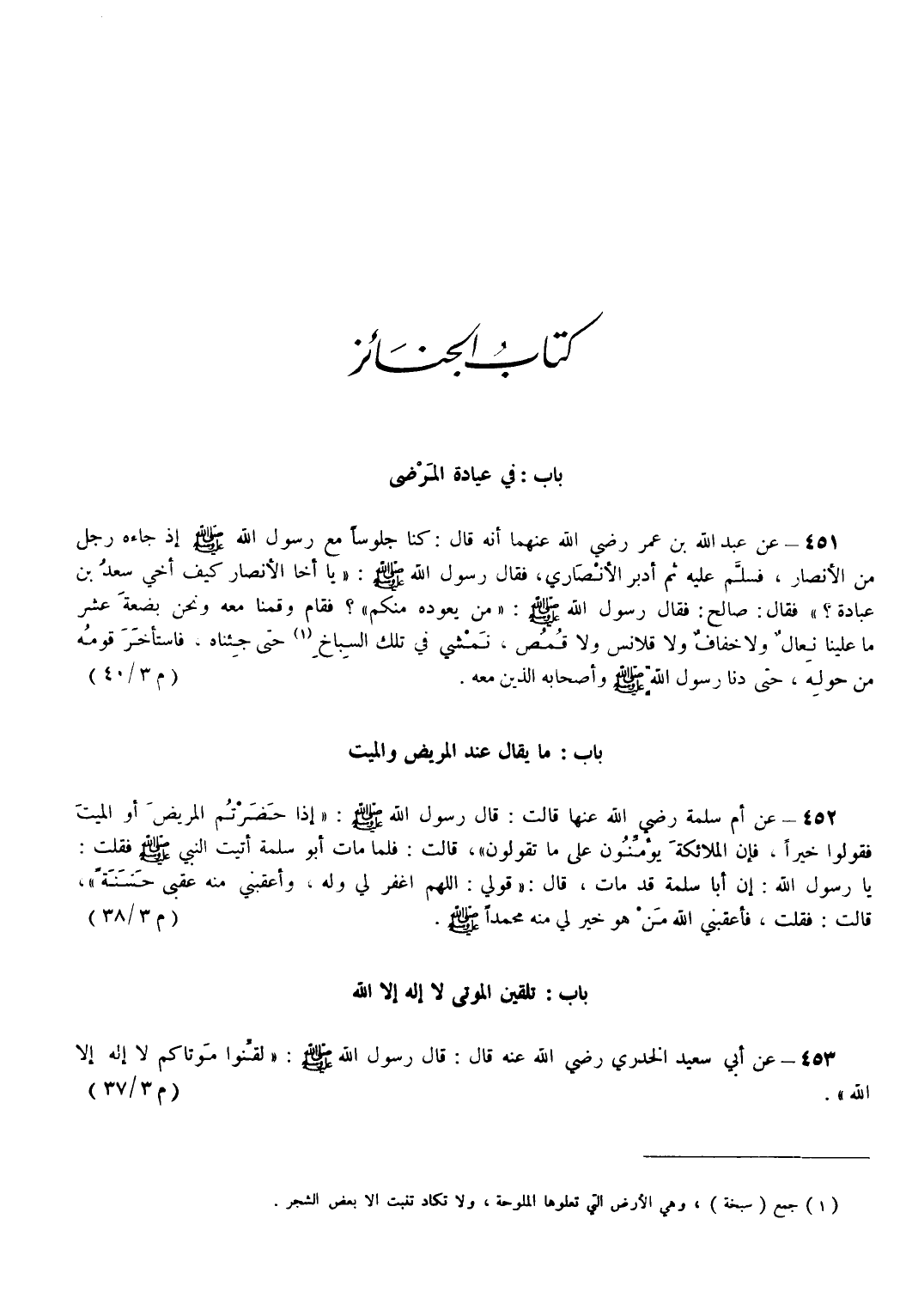 451 - عَنْ عَبْدِ اللهِ بْنِ عُمَرَ - رضي الله عنهما - أَنَّهُ قَالَ كُنَّا جُلُوسًا مَعَ رَسُولِ اللهِ - صَلَّى اللهُ عَلَيْهِ وَسَلَّمَ - إِذْ جَاءَهُ رَجُلٌ مِنْ الْأَنْصَارِ فَسَلَّمَ عَلَيْهِ ثُمَّ أَدْبَرَ الْأَنْصَارِيُّ فَقَالَ رَسُولُ اللهِ - صَلَّى اللهُ عَلَيْهِ وَسَلَّمَ - يَا أَخَا الْأَنْصَارِ كَيْفَ أَخِي سَعْدُ بْنُ عُبَادَةَ فَقَالَ صَالِحٌ فَقَالَ رَسُولُ اللهِ - صَلَّى اللهُ عَلَيْهِ وَسَلَّمَ - مَنْ يَعُودُهُ مِنْكُمْ فَقَامَ وَقُمْنَا مَعَهُ وَنَحْنُ بِضْعَةَ عَشَرَ مَا عَلَيْنَا نِعَالٌ وَلَا خِفَافٌ وَلَا قَلَانِسُ وَلَا قُمُصٌ نَمْشِي في تِلْكَ السِّبَاخِ (¬1) حَتَّى جِئْنَاهُ فَاسْتَأْخَرَ قَوْمُهُ مِنْ حَوْلِهِ حَتَّى دَنَا رَسُولُ اللهِ - صَلَّى اللهُ عَلَيْهِ وَسَلَّمَ - وَأَصْحَابُهُ الَّذِينَ مَعَهُ. (م 3/ 40)
