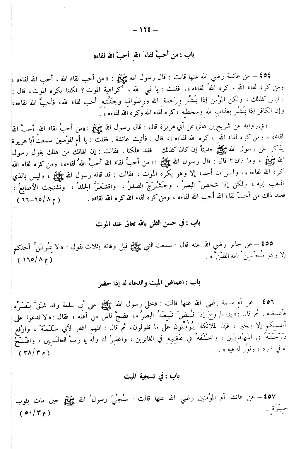 454 - عَنْ عَائِشَةَ - رضي الله عنها - قَالَتْ قَالَ رَسُولُ اللهِ - صَلَّى اللهُ عَلَيْهِ وَسَلَّمَ - مَنْ أَحَبَّ لِقَاءَ اللهِ أَحَبَّ اللهُ لِقَاءَهُ وَمَنْ كَرِهَ لِقَاءَ اللهِ كَرِهَ اللهُ لِقَاءَهُ فَقُلْتُ يَا نَبِيَّ اللهِ أَكَرَاهِيَةُ الْمَوْتِ فَكُلُّنَا نَكْرَهُ الْمَوْتَ قَالَ لَيْسَ كَذَلِكِ وَلَكِنَّ الْمُؤْمِنَ إِذَا بُشِّرَ بِرَحْمَةِ اللهِ وَرِضْوَانِهِ وَجَنَّتِهِ أَحَبَّ لِقَاءَ اللهِ فَأَحَبَّ اللهُ لِقَاءَهُ وَإِنَّ الْكَافِرَ إِذَا بُشِّرَ بِعَذَابِ اللهِ وَسَخَطِهِ كَرِهَ لِقَاءَ اللهِ وَكَرِهَ اللهُ لِقَاءَهُ.