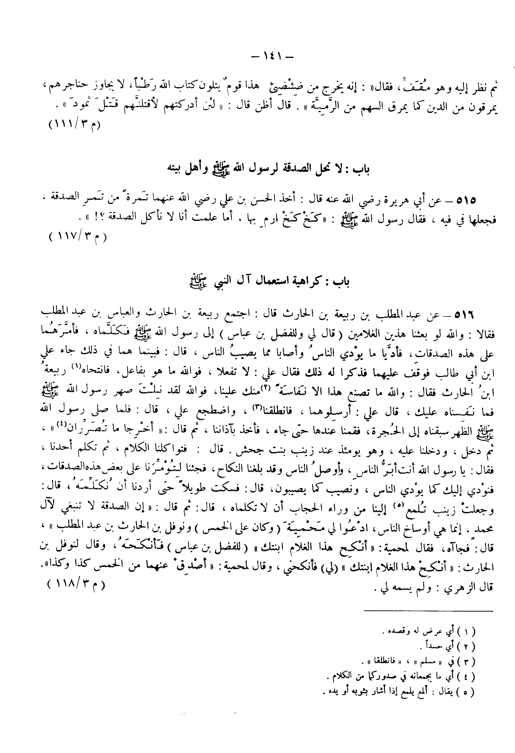 516 - عن عَبْدِ الْمُطَّلِبِ بْنِ رَبِيعَةَ بْنِ الْحَارِثِ قَالَ اجْتَمَعَ رَبِيعَةُ بْنُ الْحَارِثِ وَالْعَبَّاسُ بْنُ عَبْدِ الْمُطَّلِبِ فَقَالَا وَاللهِ لَوْ بَعَثْنَا هَذَيْنِ الْغُلَامَيْنِ قَال لِي وَلِلْفَضْلِ بْنِ عَبَّاسٍ إِلَى رَسُولِ اللهِ - صَلَّى اللهُ عَلَيْهِ وَسَلَّمَ - فَكَلَّمَاهُ فَأَمَّرَهُمَا عَلَى هَذِهِ الصَّدَقَاتِ فَأَدَّيَا مَا يُؤَدِّي النَّاسُ وَأَصَابَا مِمَّا يُصِيبُ النَّاسُ قَالَ فَبَيْنَمَا هُمَا في ذَلِكَ جَاءَ عَلِيُّ بْنُ أَبِي طَالِبٍ فَوَقَفَ عَلَيْهِمَا فَذَكَرَا لَهُ ذَلِكَ فَقَالَ عَلِيُّ لَا تَفْعَلَا فَوَاللهِ مَا هُوَ بِفَاعِلٍ فَانْتَحَاهُ (¬1) رَبِيعَةُ ابْنُ الْحَارِثِ فَقَالَ وَاللهِ مَا تَصْنَعُ هَذَا إِلَّا نَفَاسَةً (¬2) مِنْكَ عَلَيْنَا فَوَاللهِ لَقَدْ نِلْتَ صِهْرَ رَسُولِ اللهِ - صَلَّى اللهُ عَلَيْهِ وَسَلَّمَ - فَمَا نَفِسْنَاهُ عَلَيْكَ قَالَ عَلِيٌّ أَرْسِلُوهُمَا فَانْطَلَقَنا (¬3) وَاضْطَجَعَ عَلِيٌّ قَالَ فَلَمَّا صَلَّى رَسُولُ اللهِ - صَلَّى اللهُ عَلَيْهِ وَسَلَّمَ - الظُّهْرَ سَبَقْنَاهُ إِلَى الْحُجْرَةِ فَقُمْنَا عِنْدَهَا حَتَّى جَاءَ فَأَخَذَ بِآذَانِنَا ثُمَّ قَالَ أَخْرِجَا مَا تُصَرِّرَانِ (¬4) ثُمَّ دَخَلَ وَدَخَلْنَا عَلَيْهِ وَهُوَ يَوْمَئِذٍ عِنْدَ زَيْنَبَ بِنْتِ جَحْشٍ قَالَ فَتَوَاكَلْنَا الْكَلَامَ ثُمَّ تَكَلَّمَ أَحَدُنَا فَقَالَ يَا رَسُولَ اللهِ أَنْتَ أَبَرُّ النَّاسِ وَأَوْصَلُ النَّاسِ وَقَدْ بَلَغْنَا النِّكَاحَ فَجِئْنَا لِتُؤَمِّرَنَا عَلَى بَعْضِ هَذِهِ الصَّدَقَاتِ فَنُؤَدِّيَ إِلَيْكَ كَمَا يُؤَدِّي النَّاسُ وَنُصِيبَ كَمَا يُصِيبُونَ قَالَ فَسَكَتَ طَوِيلًا حَتَّى أَرَدْنَا أَنْ نُكَلِّمَهُ قَالَ وَجَعَلَتْ زَيْنَبُ تُلْمِعُ (¬5) عَلَيْنَا مِنْ وَرَاءِ الْحِجَابِ أَنْ لَا تُكَلِّمَاهُ قَالَ ثُمَّ قَالَ إِنَّ الصَّدَقَةَ لَا تَنْبَغِي لِآلِ مُحَمَّدٍ إِنَّمَا هِيَ أَوْسَاخُ النَّاسِ ادْعُوَا لِي مَحْمِيَةَ وَكَانَ عَلَى الْخُمُسِ وَنَوْفَلَ بْنَ الْحَارِثِ بْنِ عَبْدِ الْمُطَّلِبِ قَالَ فَجَاآهُ فَقَالَ لِمَحْمِيَةَ أَنْكِحْ هَذَا الْغُلَامَ ابْنَتَكَ (لِلْفَضْلِ بْنِ عَبَّاسٍ) فَأَنْكَحَهُ وَقَالَ لِنَوْفَلِ بْنِ الْحَارِثِ أَنْكِحْ هَذَا الْغُلَامَ ابْنَتَكَ (لِي) فَأَنْكَحَنِي وَقَالَ لِمَحْمِيَةَ أَصْدِقْ عَنْهُمَا مِنْ الْخُمُسِ كَذَا وَكَذَا قَالَ الزُّهْرِيُّ وَلَمْ يُسَمِّهِ لِي. (م 3/ 118)