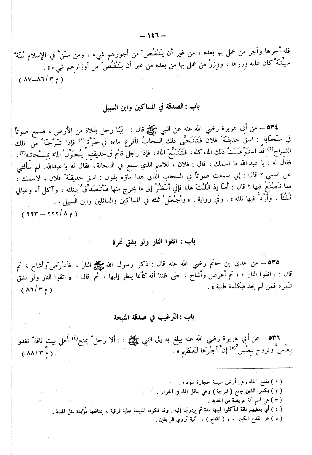 535 - عَنْ عَدِيِّ بْنِ حَاتِمٍ - رضي الله عنه - قَالَ ذَكَرَ رَسُولُ اللهِ - صَلَّى اللهُ عَلَيْهِ وَسَلَّمَ - النَّارَ فَأَعْرَضَ وَأَشَاحَ ثُمَّ قَالَ اتَّقُوا النَّارَ ثُمَّ أَعْرَضَ وَأَشَاحَ حَتَّى ظَنَنَّا أَنَّهُ كَأَنَّمَا يَنْظُرُ إِلَيْهَا ثُمَّ قَالَ اتَّقُوا النَّارَ وَلَوْ بِشِقِّ تَمْرَةٍ فَمَنْ لَمْ يَجِدْ فَبِكَلِمَةٍ طَيِّبَةٍ. (م 3/ 86)