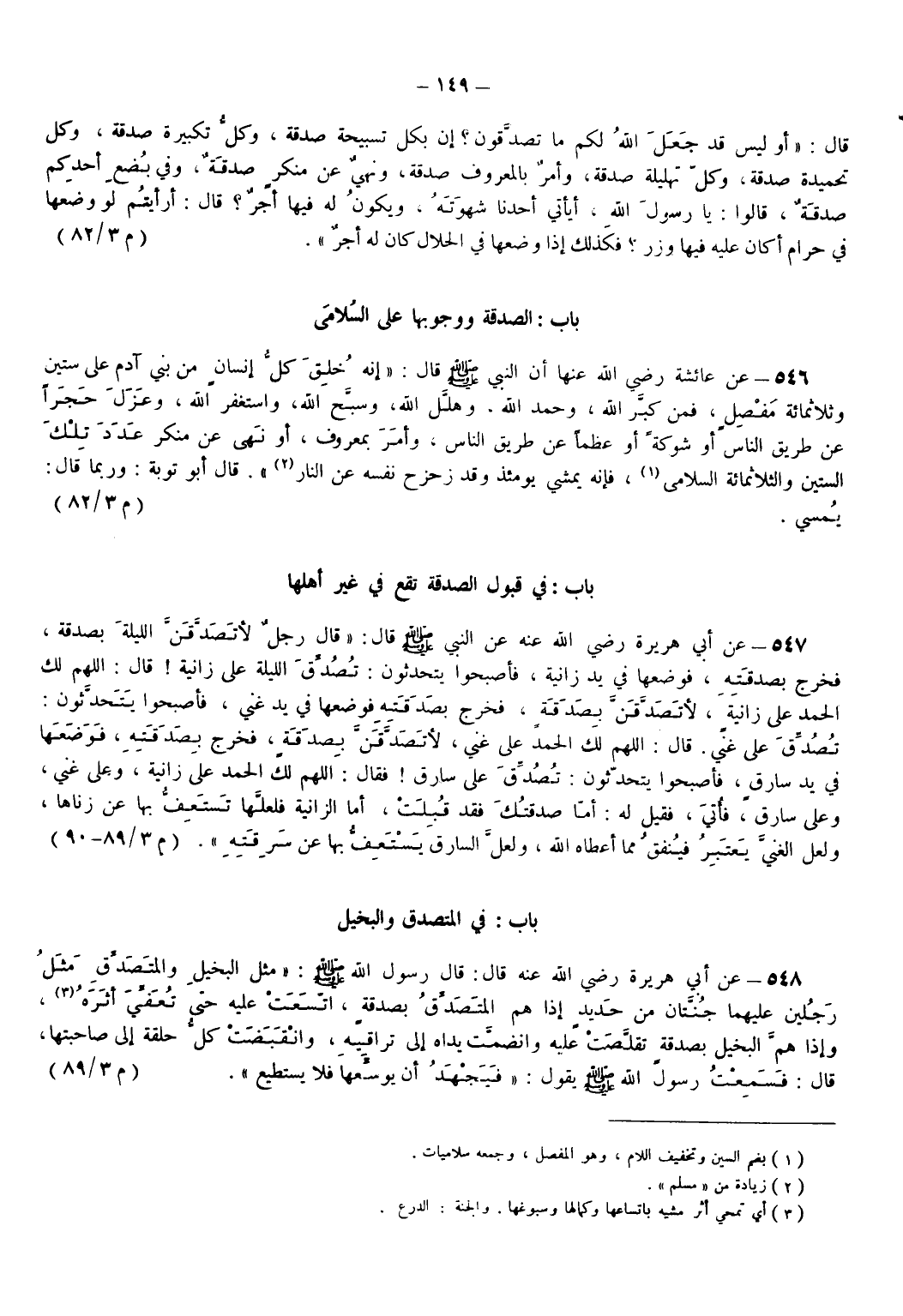 547 - عَنْ أَبِي هُرَيْرَةَ - رضي الله عنه - عَنْ النَّبِيِّ - صَلَّى اللهُ عَلَيْهِ وَسَلَّمَ - قَالَ قَالَ رَجُلٌ لَأَتَصَدَّقَنَّ اللَّيْلَةَ بِصَدَقَةٍ فَخَرَجَ بِصَدَقَتِهِ فَوَضَعَهَا في يَدِ زَانِيَةٍ فَأَصْبَحُوا يَتَحَدَّثُونَ تُصُدِّقَ اللَّيْلَةَ عَلَى زَانِيَةٍ قَالَ اللهُمَّ لَكَ الْحَمْدُ عَلَى زَانِيَةٍ لَأَتَصَدَّقَنَّ بِصَدَقَةٍ فَخَرَجَ بِصَدَقَتِهِ فَوَضَعَهَا في يَدِ غَنِيٍّ فَأَصْبَحُوا يَتَحَدَّثُونَ تُصُدِّقَ عَلَى غَنِيٍّ قَالَ اللهُمَّ لَكَ الْحَمْدُ عَلَى غَنِيٍّ لَأَتَصَدَّقَنَّ بِصَدَقَةٍ فَخَرَجَ بِصَدَقَتِهِ فَوَضَعَهَا في يَدِ سَارِقٍ فَأَصْبَحُوا يَتَحَدَّثُونَ تُصُدِّقَ عَلَى سَارِقٍ فَقَالَ اللهُمَّ لَكَ الْحَمْدُ عَلَى زَانِيَةٍ وَعَلَى غَنِيٍّ وَعَلَى سَارِقٍ فَأُتِيَ فَقِيلَ لَهُ أَمَّا صَدَقَتُكَ فَقَدْ قُبِلَتْ أَمَّا الزَّانِيَةُ فَلَعَلَّهَا تَسْتَعِفُّ بِهَا عَنْ زِنَاهَا وَلَعَلَّ الْغَنِيَّ يَعْتَبِرُ فَيُنْفِقُ مِمَّا أَعْطَاهُ اللهُ وَلَعَلَّ السَّارِقَ يَسْتَعِفُّ بِهَا عَنْ سَرِقَتِهِ. (م 3/ 89 - 90)