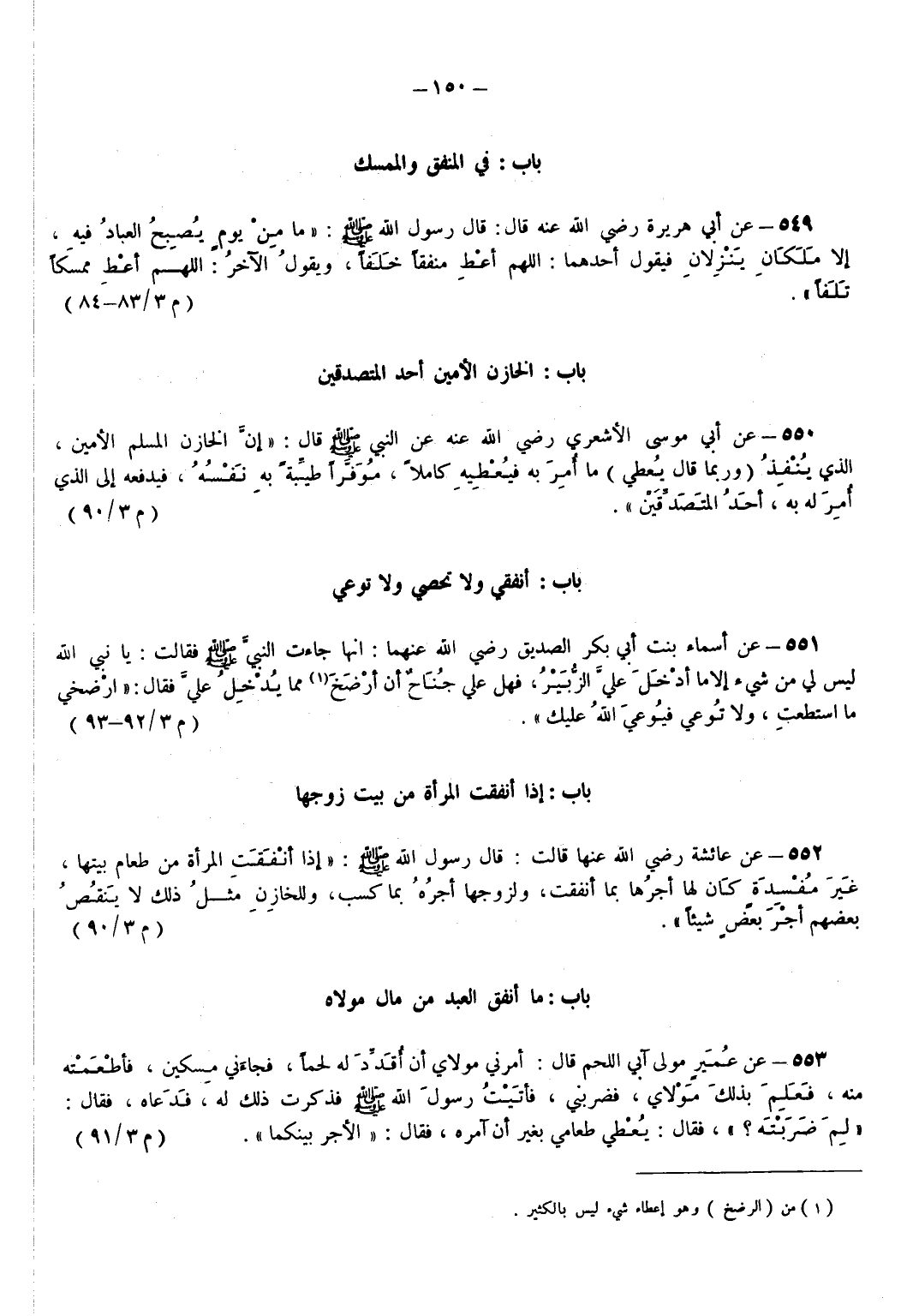 550 - عَنْ أَبِي مُوسَى الأشعري - رضي الله عنه - عَنْ النَّبِيِّ - صَلَّى اللهُ عَلَيْهِ وَسَلَّمَ - قَالَ إِنَّ الْخَازِنَ الْمُسْلِمَ الْأَمِينَ الَّذِي يُنْفِذُ (وَرُبَّمَا قَالَ يُعْطِي) مَا أُمِرَ بِهِ فَيُعْطِيهِ كَامِلًا مُوَفَّرًا طَيِّبَةً بِهِ نَفْسُهُ فَيَدْفَعُهُ إِلَى الَّذِي أُمِرَ لَهُ بِهِ أَحَدُ الْمُتَصَدِّقَيْنِ. (م 3/ 90)
