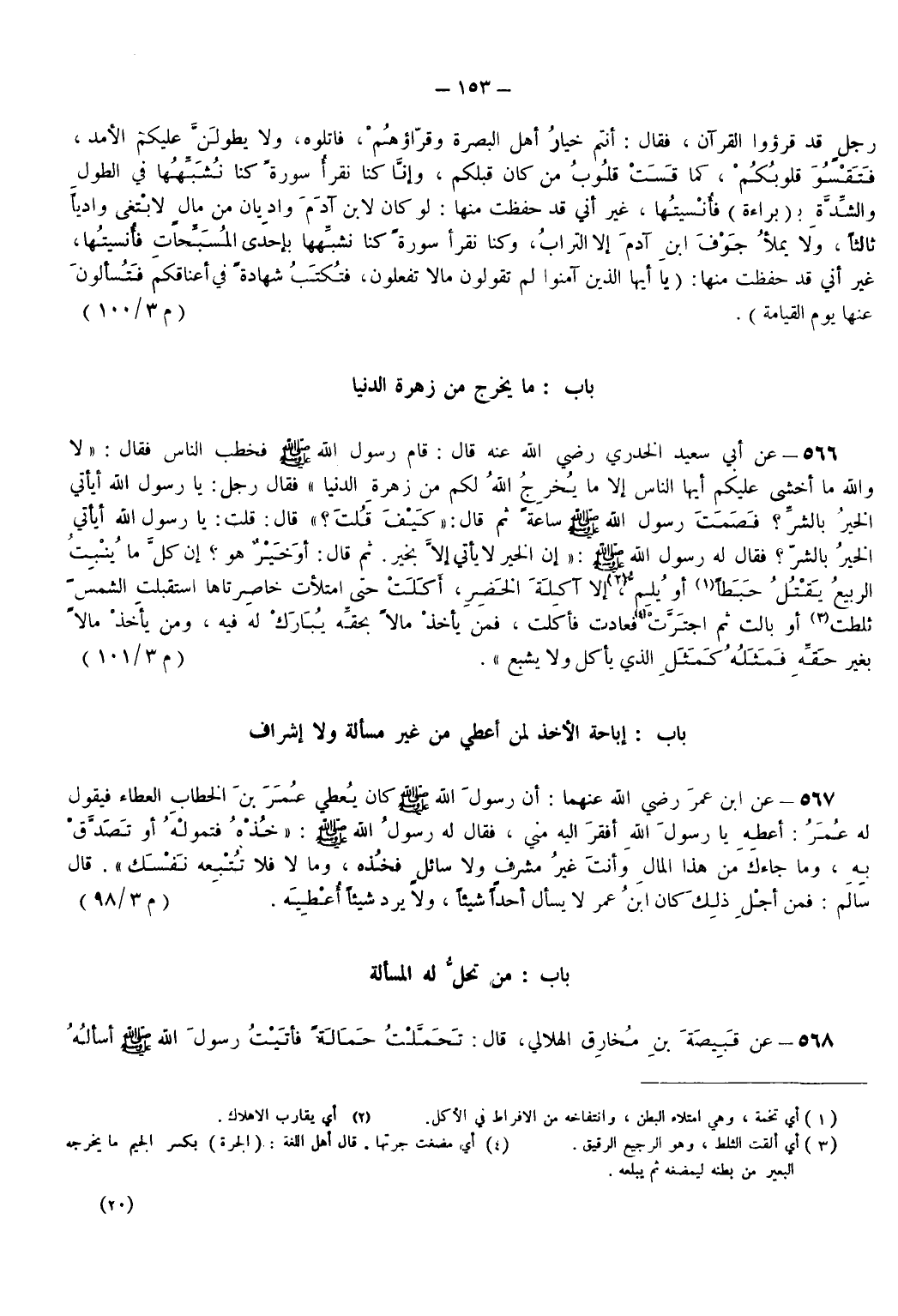 566 - عن أَبِي سَعِيدٍ الْخُدْرِيَّ - رضي الله عنه - قَالَ: قَامَ رَسُولُ اللهِ - صَلَّى اللهُ عَلَيْهِ وَسَلَّمَ - فَخَطَبَ النَّاسَ فَقَالَ لَا وَاللهِ مَا أَخْشَى عَلَيْكُمْ أَيُّهَا النَّاسُ إِلَّا مَا يُخْرِجُ اللهُ لَكُمْ مِنْ زَهْرَةِ الدُّنْيَا فَقَالَ رَجُلٌ يَا رَسُولَ اللهِ أَيَأْتِي الْخَيْرُ بِالشَّرِّ فَصَمَتَ رَسُولُ اللهِ - صَلَّى اللهُ عَلَيْهِ وَسَلَّمَ - سَاعَةً ثُمَّ قَالَ كَيْفَ قُلْتَ قَالَ قُلْتُ يَا رَسُولَ اللهِ أَيَأْتِي الْخَيْرُ بِالشَّرِّ فَقَالَ لَهُ رَسُولُ اللهِ - صَلَّى اللهُ عَلَيْهِ وَسَلَّمَ - إِنَّ الْخَيْرَ لَا يَأْتِي إِلَّا بِخَيْرٍ أَوَ خَيْرٌ هُوَ إِنَّ كُلَّ مَا يُنْبِتُ الرَّبِيعُ يَقْتُلُ حَبَطًا (¬1) أَوْ يُلِمُّ (¬2) إِلَّا آكِلَةَ الْخَضِرِ أَكَلَتْ حَتَّى إِذَا امْتَلَأَتْ خَاصِرَتَاهَا اسْتَقْبَلَتْ الشَّمْسَ ثَلَطَتْ (¬3) أَوْ بَالَتْ ثُمَّ اجْتَرَّتْ (¬4) فَعَادَتْ فَأَكَلَتْ فَمَنْ يَأْخُذْ مَالًا بِحَقِّهِ يُبَارَكْ لَهُ فِيهِ وَمَنْ يَأْخُذْ مَالًا بِغَيْرِ حَقِّهِ فَمَثَلُهُ كَمَثَلِ الَّذِي يَأْكُلُ وَلَا يَشْبَعُ. (م 3/ 101)