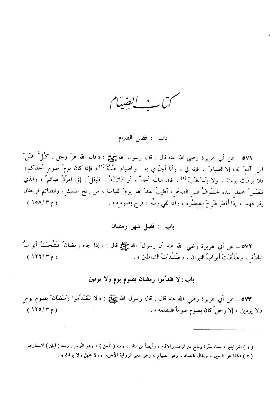 573 - عَنْ أَبِي هُرَيْرَةَ - رضي الله عنه - قَالَ قَالَ رَسُولُ اللهِ - صَلَّى اللهُ عَلَيْهِ وَسَلَّمَ - لَا تَقَدَّمُوا رَمَضَانَ بِصَوْمِ يَوْمٍ وَلَا يَوْمَيْنِ إِلَّا رَجُلٌ كَانَ يَصُومُ صَوْمًا فَلْيَصُمْهُ. (م 3/ 125)