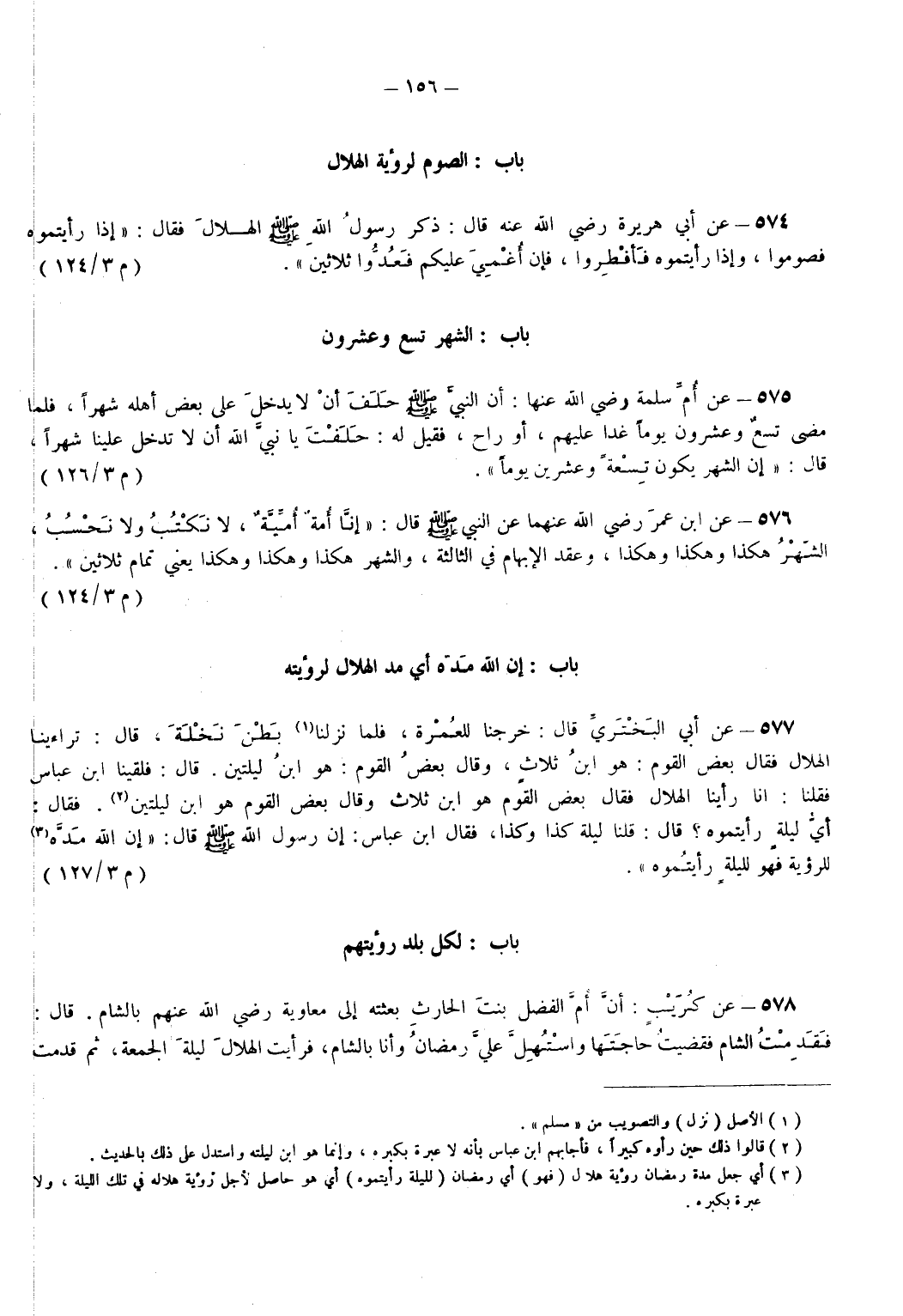 576 - عن ابْنِ عُمَرَ رَضِيَ اللهُ عَنْهُمَا عَنْ النَّبِيِّ - صَلَّى اللهُ عَلَيْهِ وَسَلَّمَ - قَالَ إِنَّا أُمَّةٌ أُمِّيَّةٌ لَا نَكْتُبُ وَلَا نَحْسُبُ الشَّهْرُ هَكَذَا وَهَكَذَا وَهَكَذَا وَعَقَدَ الْإِبْهَامَ في الثَّالِثَةِ وَالشَّهْرُ هَكَذَا وَهَكَذَا وَهَكَذَا يَعْنِي تَمَامَ ثَلَاثِينَ. (م 3/ 124)