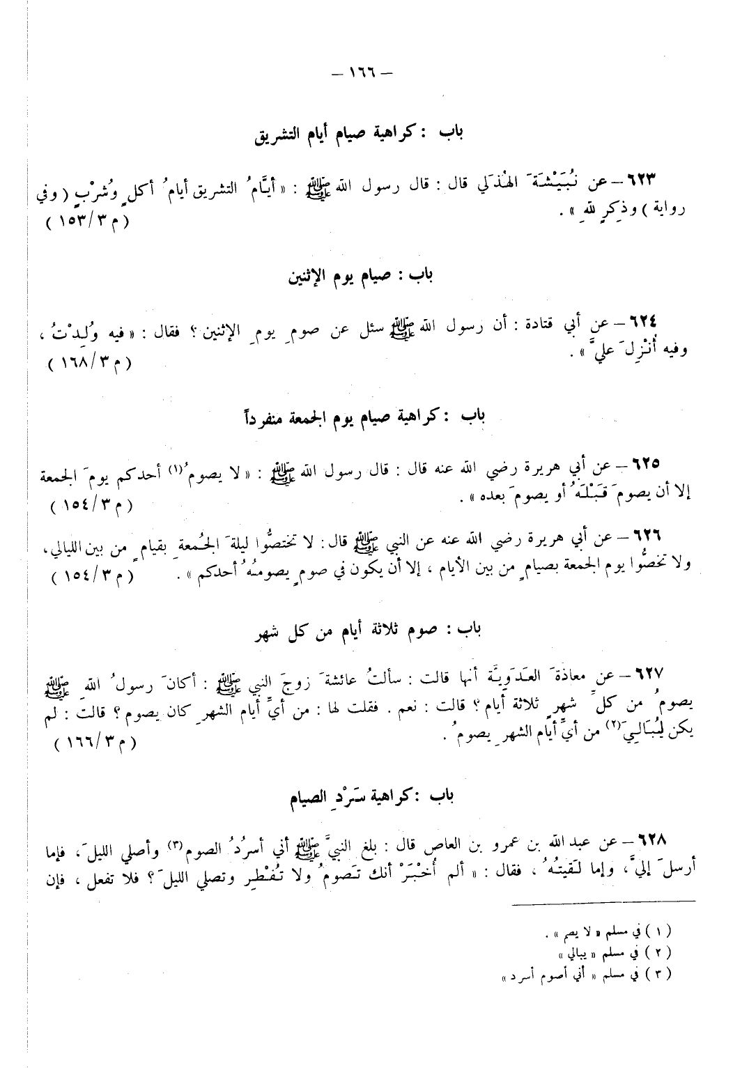 626 - عَنْ أَبِي هُرَيْرَةَ - رضي الله عنه - عَنْ النَّبِيِّ - صَلَّى اللهُ عَلَيْهِ وَسَلَّمَ - قَالَ لَا تَخْتَصُّوا لَيْلَةَ الْجُمُعَةِ بِقِيَامٍ مِنْ بَيْنِ اللَّيَالِي وَلَا تَخُصُّوا يَوْمَ الْجُمُعَةِ بِصِيَامٍ مِنْ بَيْنِ الْأَيَّامِ إِلَّا أَنْ يَكُونَ في صَوْمٍ يَصُومُهُ أَحَدُكُمْ. (م 3/ 154)