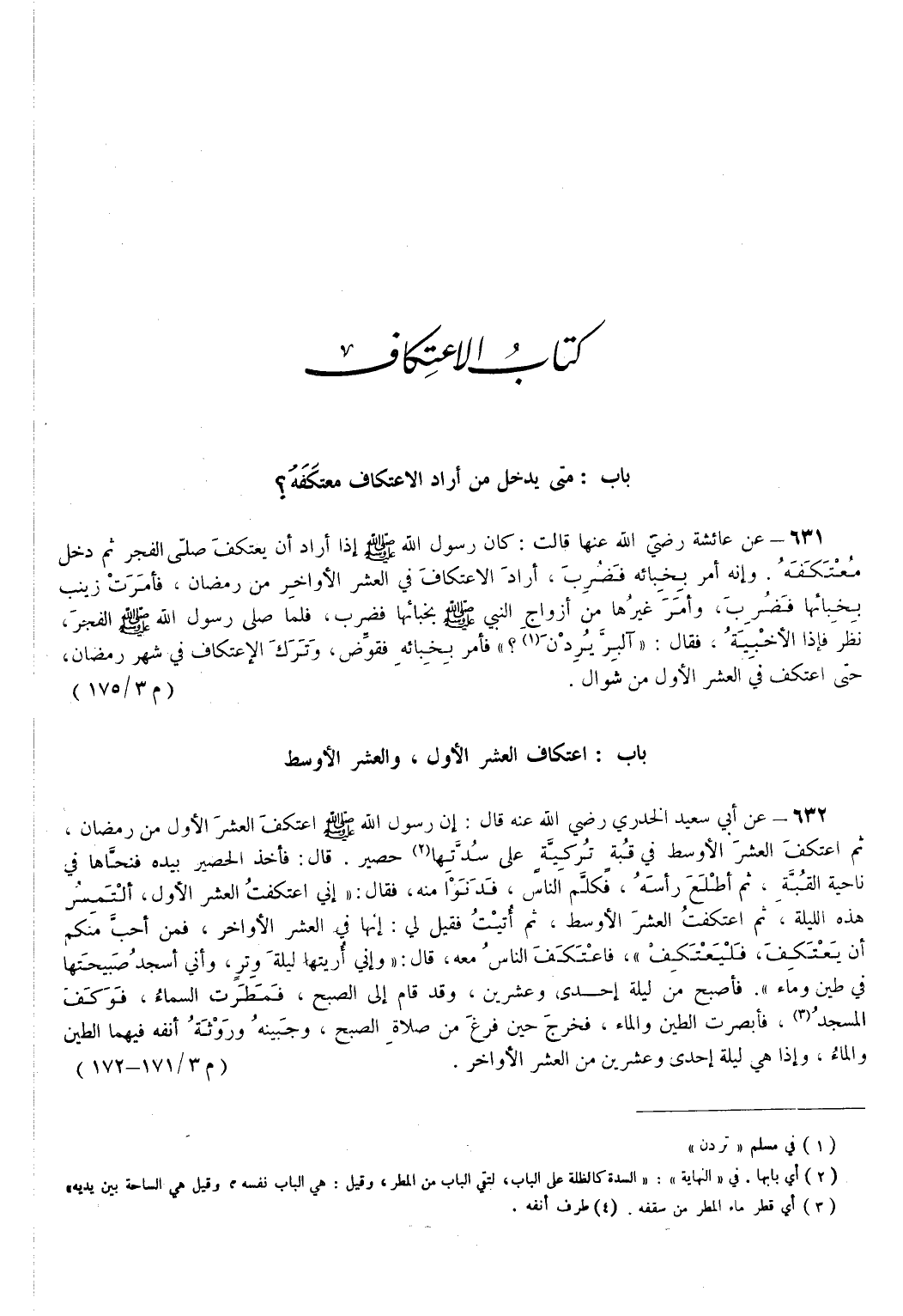 631 - عَنْ عَائِشَةَ - رضي الله عنها - قَالَتْ كَانَ رَسُولُ اللهِ - صَلَّى اللهُ عَلَيْهِ وَسَلَّمَ - إِذَا أَرَادَ أَنْ يَعْتَكِفَ صَلَّى الْفَجْرَ ثُمَّ دَخَلَ مُعْتَكَفَهُ وَإِنَّهُ أَمَرَ بِخِبَائِهِ فَضُرِبَ أَرَادَ الِاعْتِكَافَ في الْعَشْرِ الْأَوَاخِرِ مِنْ رَمَضَانَ فَأَمَرَتْ زَيْنَبُ بِخِبَائِهَا فَضُرِبَ وَأَمَرَ غَيْرُهَا مِنْ أَزْوَاجِ النَّبِيِّ - صَلَّى اللهُ عَلَيْهِ وَسَلَّمَ - بِخِبَائِها فَضُرِبَ فَلَمَّا صَلَّى رَسُولُ اللهِ - صَلَّى اللهُ عَلَيْهِ وَسَلَّمَ - الْفَجْرَ نَظَرَ فَإِذَا الْأَخْبِيَةُ فَقَالَ آلْبِرَّ يُرِدْنَ (¬1) فَأَمَرَ بِخِبَائِهِ فَقُوِّضَ وَتَرَكَ الِاعْتِكَافَ في شَهْرِ رَمَضَانَ حَتَّى اعْتَكَفَ في الْعَشْرِ الْأَوَّلِ مِنْ شَوَّالٍ. (م 3/ 175)