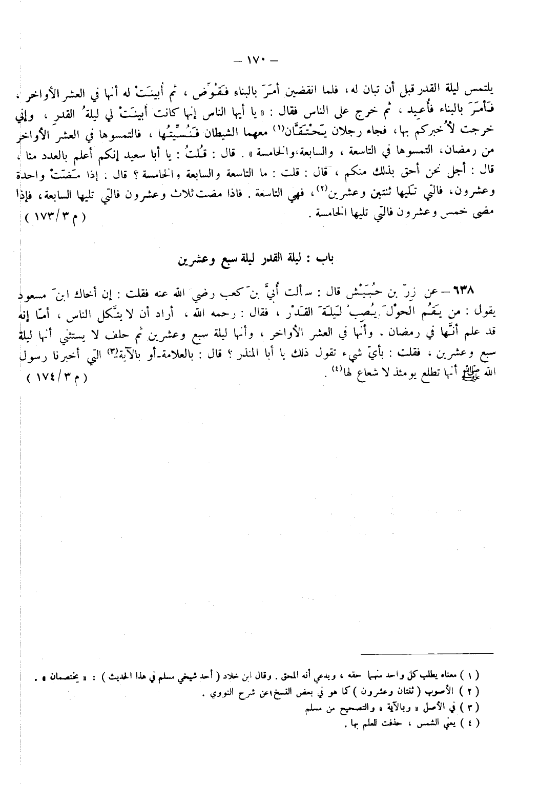 638 - عن زِرِّ بْنِ حُبَيْشٍ قال سَأَلْتُ أُبَيَّ بْنَ كَعْبٍ رَضِيَ اللهُ عَنْهُ فَقُلْتُ إِنَّ أَخَاكَ ابْنَ مَسْعُودٍ يَقُولُ مَنْ يَقُمْ الْحَوْلَ يُصِبْ لَيْلَةَ الْقَدْرِ فَقَالَ رَحِمَهُ اللهُ أَرَادَ أَنْ لَا يَتَّكِلَ النَّاسُ أَمَا إِنَّهُ قَدْ عَلِمَ أَنَّهَا في رَمَضَانَ وَأَنَّهَا في الْعَشْرِ الْأَوَاخِرِ وَأَنَّهَا لَيْلَةُ سَبْعٍ وَعِشْرِينَ ثُمَّ حَلَفَ لَا يَسْتَثْنِي أَنَّهَا لَيْلَةُ سَبْعٍ وَعِشْرِينَ فَقُلْتُ بِأَيِّ شَيْءٍ تَقُولُ ذَلِكَ يَا أَبَا الْمُنْذِرِ قَالَ بِالْعَلَامَةِ أَوْ بِالْآيَةِ (¬3) الَّتِي أَخْبَرَنَا رَسُولُ اللهِ - صَلَّى اللهُ عَلَيْهِ وَسَلَّمَ - أَنَّهَا تَطْلُعُ يَوْمَئِذٍ لَا شُعَاعَ لَهَا (¬4). (م 3/ 174)