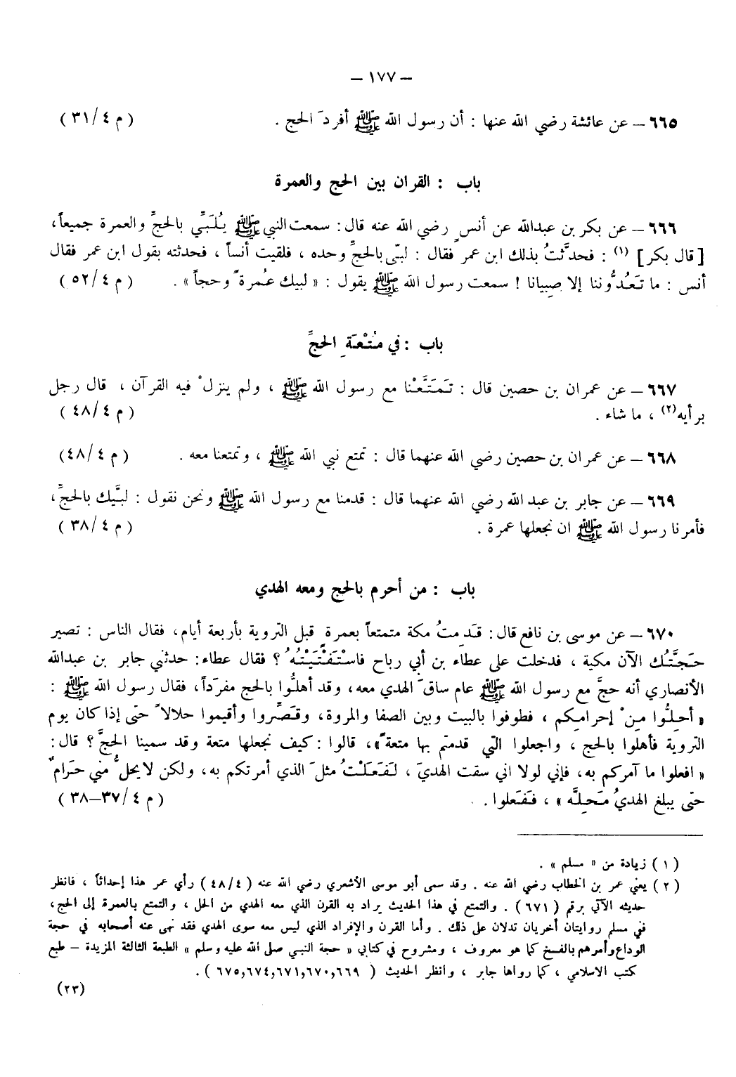 670 - عن مُوسَى بْنِ نَافِعٍ قَالَ قَدِمْتُ مَكَّةَ مُتَمَتِّعًا بِعُمْرَةٍ قَبْلَ التَّرْوِيَةِ بِأَرْبَعَةِ أَيَّامٍ فَقَالَ النَّاسُ تَصِيرُ حَجَّتُكَ الْآنَ مَكِّيَّةً فَدَخَلْتُ عَلَى عَطَاءِ بْنِ أَبِي رَبَاحٍ فَاسْتَفْتَيْتُهُ فَقَالَ عَطَاءٌ حَدَّثَنِي جَابِرُ بْنُ عَبْدِ اللهِ الْأَنْصَارِيُّ أَنَّهُ حَجَّ مَعَ رَسُولِ اللهِ - صَلَّى اللهُ عَلَيْهِ وَسَلَّمَ - عَامَ سَاقَ الْهَدْيَ مَعَهُ وَقَدْ أَهَلُّوا بِالْحَجِّ مُفْرَدًا فَقَالَ رَسُولُ اللهِ - صَلَّى اللهُ عَلَيْهِ وَسَلَّمَ - أَحِلُّوا مِنْ إِحْرَامِكُمْ فَطُوفُوا بِالْبَيْتِ وَبَيْنَ الصَّفَا وَالْمَرْوَةِ وَقَصِّرُوا وَأَقِيمُوا حَلَالًا حَتَّى إِذَا كَانَ يَوْمُ التَّرْوِيَةِ فَأَهِلُّوا بِالْحَجِّ وَاجْعَلُوا الَّتِي قَدِمْتُمْ بِهَا مُتْعَةً قَالُوا كَيْفَ نَجْعَلُهَا مُتْعَةً وَقَدْ سَمَّيْنَا الْحَجَّ قَالَ افْعَلُوا مَا آمُرُكُمْ بِهِ فَإِنِّي لَوْلَا أَنِّي سُقْتُ الْهَدْيَ لَفَعَلْتُ مِثْلَ الَّذِي أَمَرْتُكُمْ بِهِ وَلَكِنْ لَا يَحِلُّ مِنِّي حَرَامٌ حَتَّى يَبْلُغَ الْهَدْيُ مَحِلَّهُ فَفَعَلُوا. (م 4/ 37 - 38)