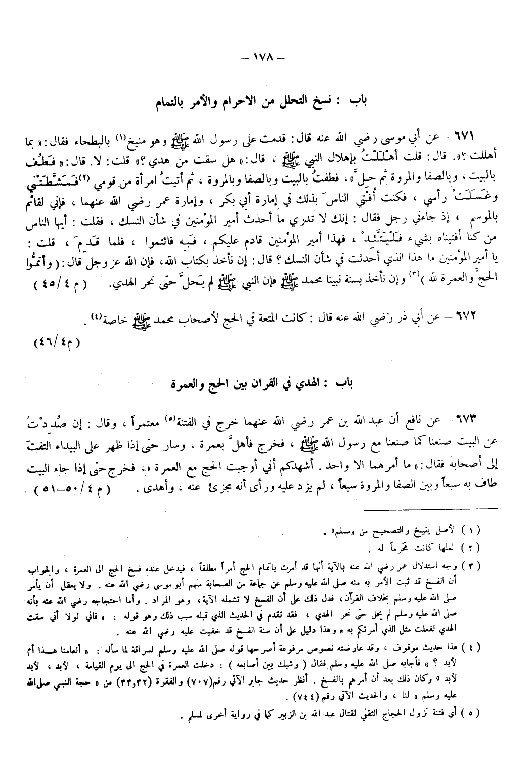 (¬3) وجه استدلال عمر رضي الله عنه بالآية أنها قد أمرت باتمام الحج أمرا مطلقاً، فيدخل عنده فسخ الحج إلى العمرة، والجواب أن الفسخ قد ثبت الأمر به منه صلى الله عليه وسلم عن جماعة من الصحابة منهم أبو موسى رضي الله عنه. ولا يعقل أن يأمر صلى الله عليه وسلم بخلاف القرآن، فدل ذلك على أن الفسخ لا تشمله الآية، وهو المراد. وأما احتجاجه رضي الله عنه بأنه صلى الله عليه وسلم لم يحل حتى نحر الهدي، فقد تقدم في الحديث الذي قبله سببب ذلك وهو قوله: "فإني لولا أني سقت الهدي لفعلت مثل الذي أمرتكم به" وهذا دليل على أن سنة الفسخ قد خفيت عليه رضي الله عنه.