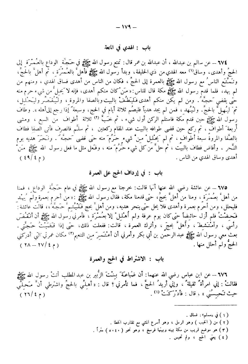 676 - عَنْ ابْنِ عَبَّاسٍ - رضي الله عنهما - أَنَّ ضُبَاعَةَ بِنْتَ الزُّبَيْرِ بْنِ عَبْدِ الْمُطَّلِبِ أَتَت رَسُولَ اللهِ - صَلَّى اللهُ عَلَيْهِ وَسَلَّمَ - فَقَالَتْ إِنِّي امْرَأَةٌ ثَقِيلَةٌ وَإِنِّي أُرِيدُ الْحَجَّ فَمَا تَأْمُرُنِي قَالَ أَهِلِّي بِالْحَجِّ وَاشْتَرِطِي أَنَّ مَحِلِّي حَيْثُ تَحْبِسُنِي قَالَ فَأَدْرَكَتْ (¬4). (م 4/ 26)