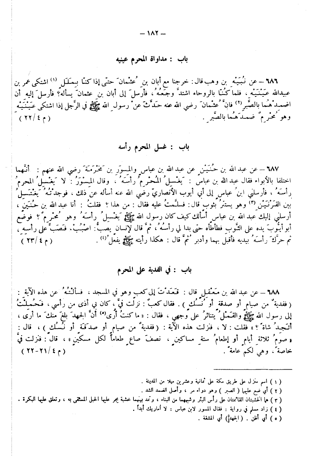 686 - عَنْ نُبَيْهِ بْنِ وَهْبٍ قَالَ خَرَجْنَا مَعَ أَبَانَ بْنِ عُثْمَانَ حَتَّى إِذَا كُنَّا بِمَلَلٍ (¬1) اشْتَكَى عُمَرُ بْنُ عُبَيْدِ اللهِ عَيْنَيْهِ فَلَمَّا كُنَّا بِالرَّوْحَاءِ اشْتَدَّ وَجَعُهُ فَأَرْسَلَ إِلَى أَبَانَ بْنِ عُثْمَانَ يَسْأَلُهُ فَأَرْسَلَ إِلَيْهِ أَنْ اضْمِدْهُمَا بِالصَّبِرِ (¬2) فَإِنَّ عُثْمَانَ رَضِيَ اللهُ عَنْهُ حَدَّثَ عَنْ رَسُولِ اللهِ - صَلَّى اللهُ عَلَيْهِ وَسَلَّمَ - في الرَّجُلِ إِذَا اشْتَكَى عَيْنَيْهِ وَهُوَ مُحْرِمٌ ضَمَّدَهُمَا بِالصَّبِرِ. (م 4/ 22)