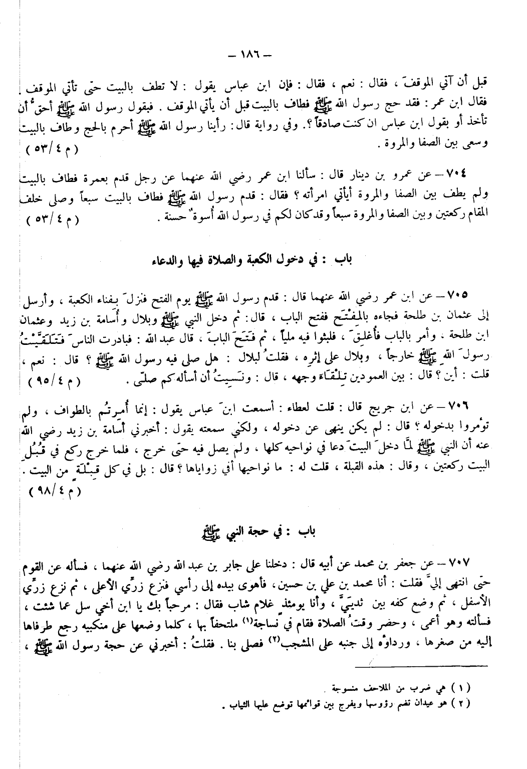 707 - عَنْ جَعْفَرِ بْنِ مُحَمَّدٍ عَنْ أَبِيهِ قَالَ دَخَلْنَا عَلَى جَابِرِ بْنِ عَبْدِ اللهِ - رضي الله عنهما - فَسَأَلَ عَنْ الْقَوْمِ حَتَّى انْتَهَى إِلَيَّ فَقُلْتُ أَنَا مُحَمَّدُ بْنُ عَلِيِّ بْنِ حُسَيْنٍ فَأَهْوَى بِيَدِهِ إِلَى رَأْسِي فَنَزَعَ زِرِّي الْأَعْلَى ثُمَّ نَزَعَ زِرِّي الْأَسْفَلَ ثُمَّ وَضَعَ كَفَّهُ بَيْنَ ثَدْيَيَّ وَأَنَا يَوْمَئِذٍ غُلَامٌ شَابٌّ فَقَالَ مَرْحَبًا بِكَ يَا ابْنَ أَخِي سَلْ عَمَّا شِئْتَ فَسَأَلْتُهُ وَهُوَ أَعْمَى وَحَضَرَ وَقْتُ الصَّلَاةِ فَقَامَ في نِسَاجَةٍ (¬1) مُلْتَحِفًا بِهَا كُلَّمَا وَضَعَهَا عَلَى مَنْكِبِيهِ رَجَعَ طَرَفَاهَا إِلَيْهِ مِنْ صِغَرِهَا وَرِدَاؤُهُ إِلَى جَنْبِهِ عَلَى الْمِشْجَبِ (¬2) فَصَلَّى بِنَا فَقُلْتُ أَخْبِرْنِي عَنْ حَجَّةِ رَسُولِ اللهِ - صَلَّى اللهُ عَلَيْهِ وَسَلَّمَ -