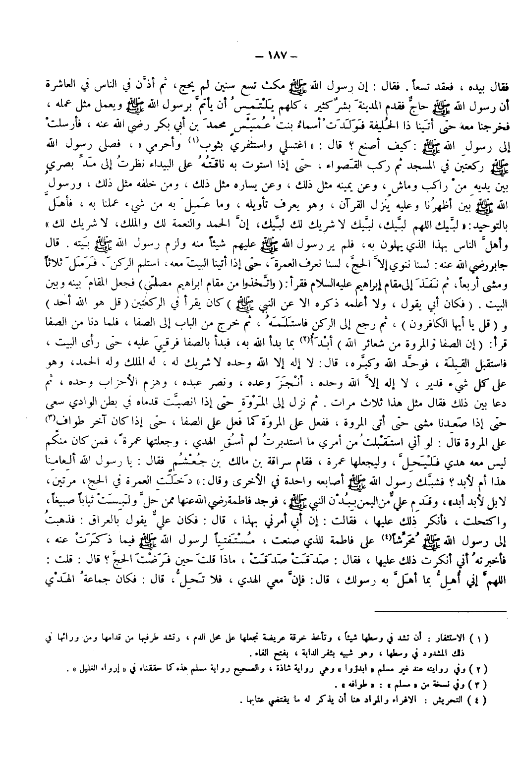 فَقَالَ بِيَدِهِ فَعَقَدَ تِسْعًا فَقَالَ إِنَّ رَسُولَ اللهِ - صَلَّى اللهُ عَلَيْهِ وَسَلَّمَ - مَكَثَ تِسْعَ سِنِينَ لَمْ يَحُجَّ ثُمَّ أَذَّنَ في النَّاسِ في الْعَاشِرَةِ أَنَّ رَسُولَ اللهِ - صَلَّى اللهُ عَلَيْهِ وَسَلَّمَ - حَاجٌّ فَقَدِمَ الْمَدِينَةَ بَشَرٌ كَثِيرٌ كُلُّهُمْ يَلْتَمِسُ أَنْ يَأْتَمَّ بِرَسُولِ اللهِ - صَلَّى اللهُ عَلَيْهِ وَسَلَّمَ - وَيَعْمَلَ مِثْلَ عَمَلِهِ فَخَرَجْنَا مَعَهُ حَتَّى أَتَيْنَا ذَا الْحُلَيْفَةِ فَوَلَدَتْ أَسْمَاءُ بِنْتُ عُمَيْسٍ مُحَمَّدَ بْنَ أَبِي بَكْرٍ - رضي الله عنه - فَأَرْسَلَتْ إِلَى رَسُولِ اللهِ - صَلَّى اللهُ عَلَيْهِ وَسَلَّمَ - كَيْفَ أَصْنَعُ قَالَ اغْتَسِلِي وَاسْتَثْفِرِي بِثَوْبٍ (¬1) وَأَحْرِمِي فَصَلَّى رَسُولُ اللهِ - صَلَّى اللهُ عَلَيْهِ وَسَلَّمَ - ركعتين في الْمَسْجِدِ ثُمَّ رَكِبَ الْقَصْوَاءَ حَتَّى إِذَا اسْتَوَتْ بِهِ نَاقَتُهُ عَلَى الْبَيْدَاءِ نَظَرْتُ إِلَى مَدِّ بَصَرِي بَيْنَ يَدَيْهِ مِنْ رَاكِبٍ وَمَاشٍ وَعَنْ يَمِينِهِ مِثْلَ ذَلِكَ وَعَنْ يَسَارِهِ مِثْلَ ذَلِكَ وَمِنْ خَلْفِهِ مِثْلَ ذَلِكَ وَرَسُولُ اللهِ - صَلَّى اللهُ عَلَيْهِ وَسَلَّمَ - بَيْنَ أَظْهُرِنَا وَعَلَيْهِ يَنْزِلُ الْقُرْآنُ وَهُوَ يَعْرِفُ تَأْوِيلَهُ وَمَا عَمِلَ بِهِ مِنْ شَيْءٍ عَمِلْنَا بِهِ فَأَهَلَّ بِالتَّوْحِيدِ لَبَّيْكَ اللهُمَّ لَبَّيْكَ لَبَّيْكَ لَا شَرِيكَ لَكَ لَبَّيْكَ إِنَّ الْحَمْدَ وَالنِّعْمَةَ لَكَ وَالْمُلْكَ لَا شَرِيكَ لَكَ وَأَهَلَّ النَّاسُ بِهَذَا الَّذِي يُهِلُّونَ بِهِ فَلَمْ يَر رَسُولُ اللهِ - صَلَّى اللهُ عَلَيْهِ وَسَلَّمَ - عَلَيْهِمْ شَيْئًا مِنْهُ وَلَزِمَ رَسُولُ اللهِ - صَلَّى اللهُ عَلَيْهِ وَسَلَّمَ - قَالَ جَابِرٌ رَضِيَ اللهُ عَنْهُ لَسْنَا نَنْوِي إِلَّا الْحَجَّ لَسْنَا نَعْرِفُ الْعُمْرَةَ حَتَّى إِذَا أَتَيْنَا الْبَيْتَ مَعَهُ اسْتَلَمَ الرُّكْنَ فَرَمَلَ ثَلَاثًا وَمَشَى أَرْبَعًا ثُمَّ نَفَذَ إِلَى مَقَامِ إِبْرَاهِيمَ عَلَيْهِ السَّلَام فَقَرَأَ: (وَاتَّخِذُوا مِنْ مَقَامِ إِبْرَاهِيمَ مُصَلًّى) فَجَعَلَ الْمَقَامَ بَيْنَهُ وَبَيْنَ الْبَيْتِ فَكَانَ أَبِي يَقُولُ وَلَا أَعْلَمُهُ ذَكَرَهُ إِلَّا عَنْ النَّبِيِّ - صَلَّى اللهُ عَلَيْهِ وَسَلَّمَ - كَانَ يَقْرَأُ في الرَّكْعَتَيْنِ (قُلْ هُوَ اللهُ أَحَدٌ) وَ (قُلْ يَا أَيُّهَا الْكَافِرُونَ) ثُمَّ رَجَعَ إِلَى الرُّكْنِ فَاسْتَلَمَهُ ثُمَّ خَرَجَ مِنْ الْبَابِ إِلَى الصَّفَا فَلَمَّا دَنَا مِنْ الصَّفَا قَرَأَ (إِنَّ الصَّفَا والْمَرْوَةَ مِنْ شَعَائِرِ اللهِ) أَبْدَأُ (¬2) بِمَا بَدَأَ اللهُ بِهِ فَبَدَأَ بِالصَّفَا فَرَقِيَ عَلَيْهِ حَتَّى رَأَى الْبَيْتَ فَاسْتَقْبَلَ الْقِبْلَةَ فَوَحَّدَ اللهَ وَكَبَّرَهُ وَقَالَ لَا إِلَهَ إِلَّا اللهُ وَحْدَهُ لَا شَرِيكَ لَهُ لَهُ الْمُلْكُ وَلَهُ الْحَمْدُ وَهُوَ عَلَى كُلِّ شَيْءٍ قَدِيرٌ لَا إِلَهَ إِلَّا اللهُ وَحْدَهُ أَنْجَزَ وَعْدَهُ وَنَصَرَ عَبْدَهُ وَهَزَمَ الْأَحْزَابَ وَحْدَهُ ثُمَّ دَعَا بَيْنَ ذَلِكَ قَالَ مِثْلَ هَذَا ثَلَاثَ مَرَّاتٍ ثُمَّ نَزَلَ إِلَى الْمَرْوَةِ حَتَّى إِذَا انْصَبَّتْ قَدَمَاهُ في بَطْنِ الْوَادِي سَعَى حَتَّى إِذَا صَعِدَتَا مَشَى حَتَّى أَتَى الْمَرْوَةَ فَفَعَلَ عَلَى الْمَرْوَةِ كَمَا فَعَلَ عَلَى الصَّفَا حَتَّى إِذَا كَانَ آخِرُ طَوَاف (¬3) عَلَى الْمَرْوَةِ فَقَالَ لَوْ أَنِّي اسْتَقْبَلْتُ مِنْ أَمْرِي مَا اسْتَدْبَرْتُ لَمْ أَسُقْ الْهَدْيَ وَجَعَلْتُهَا عُمْرَةً فَمَنْ كَانَ مِنْكُمْ لَيْسَ مَعَهُ هَدْيٌ فَلْيَحِلَّ وَلْيَجْعَلْهَا عُمْرَةً فَقَامَ سُرَاقَةُ بْنُ مَالِكِ بْنِ جُعْشُمٍ فَقَالَ يَا رَسُولَ اللهِ أَلِعَامِنَا هَذَا أَم