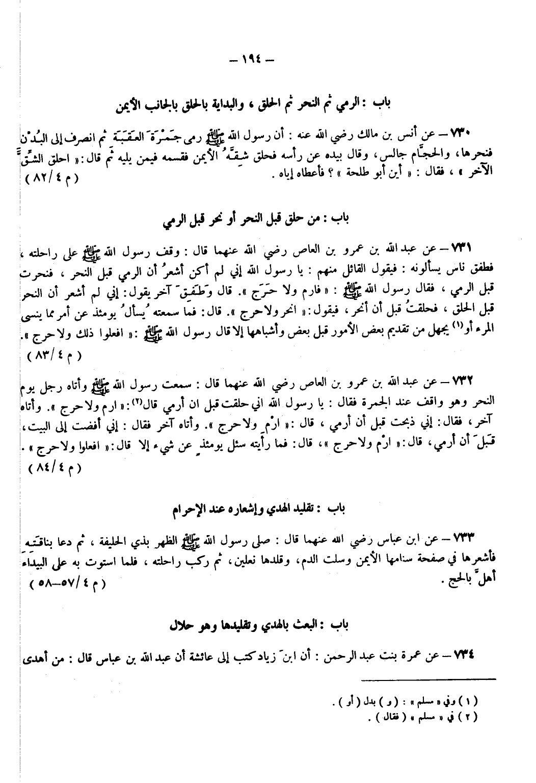 733 - عَنْ ابْنِ عَبَّاسٍ رَضِيَ اللهُ عَنْهُمَا قَالَ صَلَّى رَسُولُ اللهِ - صَلَّى اللهُ عَلَيْهِ وَسَلَّمَ - الظُّهْرَ بِذِي الْحُلَيْفَةِ ثُمَّ دَعَا بِنَاقَتِهِ فَأَشْعَرَهَا في صَفْحَةِ سَنَامِهَا الْأَيْمَنِ وَسَلَتَ الدَّمَ وَقَلَّدَهَا نَعْلَيْنِ ثُمَّ رَكِبَ رَاحِلَتَهُ فَلَمَّا اسْتَوَتْ بِهِ عَلَى الْبَيْدَاءِ أَهَلَّ بِالْحَجِّ. (م 4/ 57 - 58)