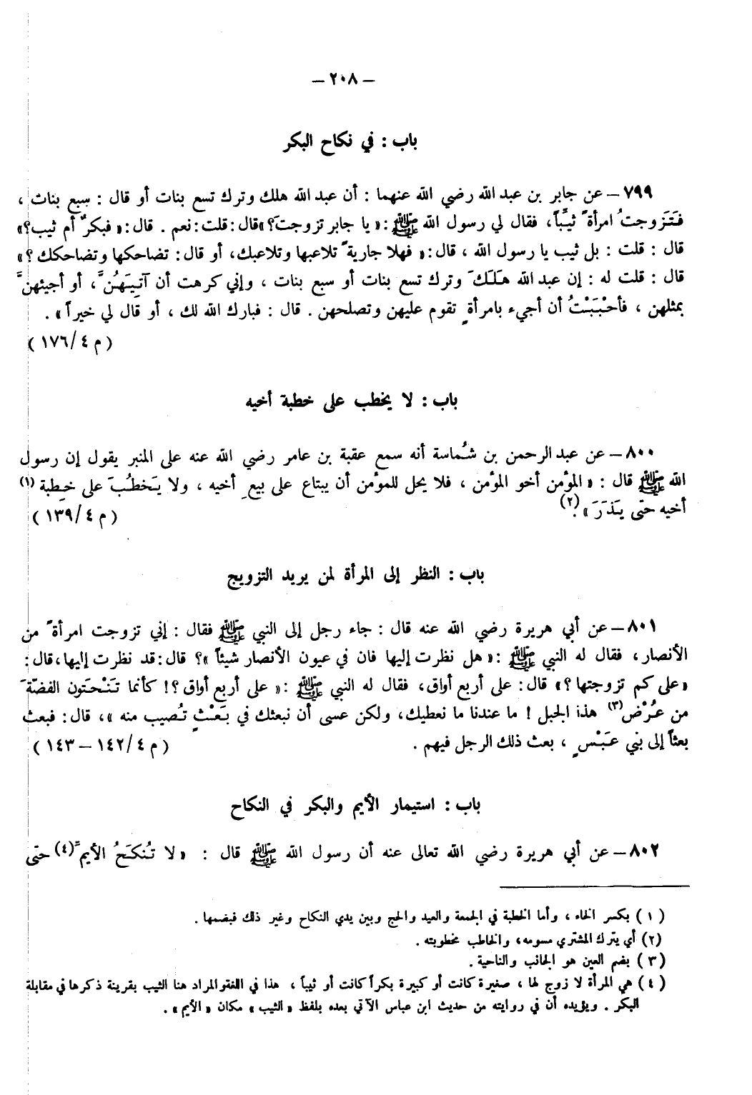 799 - عَنْ جَابِرِ بْنِ عَبْدِ اللهِ - رضي الله عنهما - أَنَّ عَبْدَ اللهِ هَلَكَ وَتَرَكَ تِسْعَ بَنَاتٍ أَوْ قَالَ سَبْعَ بنات فَتَزَوَّجْتُ امْرَأَةً ثَيِّبًا فَقَالَ لِي رَسُولُ اللهِ - صَلَّى اللهُ عَلَيْهِ وَسَلَّمَ - يَا جَابِرُ تَزَوَّجْتَ قَالَ قُلْتُ نَعَمْ قَالَ فَبِكْرٌ أَمْ ثَيِّبٌ قَالَ قُلْتُ بَلْ ثَيِّبٌ يَا رَسُولَ اللهِ قَالَ فَهَلَّا جَارِيَةً تُلَاعِبُهَا وَتُلَاعِبُكَ أَوْ قَالَ تُضَاحِكُهَا وَتُضَاحِكُكَ قَالَ قُلْتُ لَهُ إِنَّ عَبْدَ اللهِ هَلَكَ وَتَرَكَ تِسْعَ بَنَاتٍ أَوْ سَبْعَ بنات وَإِنِّي كَرِهْتُ أَنْ آتِيَهُنَّ أَوْ أَجِيئَهُنَّ بِمِثْلِهِنَّ فَأَحْبَبْتُ أَنْ أَجِيءَ بِامْرَأَةٍ تَقُومُ عَلَيْهِنَّ وَتُصْلِحُهُنَّ قَالَ فَبَارَكَ اللهُ لَكَ أَوْ قَالَ لِي خَيْرًا. (م 4/ 176)