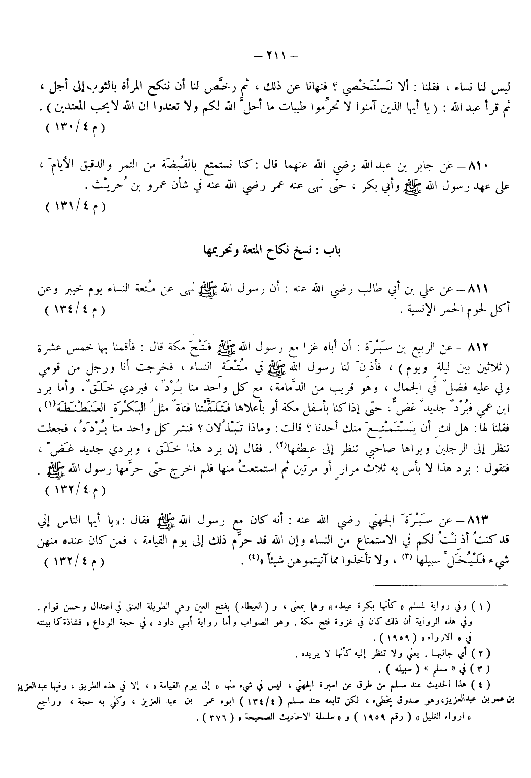 813 - عن سَبْرَة الْجُهَنِيِّ - رضي الله عنه - أَنَّهُ كَانَ مَعَ رَسُولِ اللهِ - صَلَّى اللهُ عَلَيْهِ وَسَلَّمَ - فَقَالَ يَا أَيُّهَا النَّاسُ إِنِّي قَدْ كُنْتُ أَذِنْتُ لَكُمْ في الِاسْتِمْتَاعِ مِنْ النِّسَاءِ وَإِنَّ اللهَ قَدْ حَرَّمَ ذَلِكَ إِلَى يَوْمِ الْقِيَامَةِ فَمَنْ كَانَ عِنْدَهُ مِنْهُنَّ شَيْءٌ فَلْيُخَلِّ سَبِيلَهُا (¬3) وَلَا تَأْخُذُوا مِمَّا آتَيْتُمُوهُنَّ شَيْئًا (¬4). (م 4/ 132)