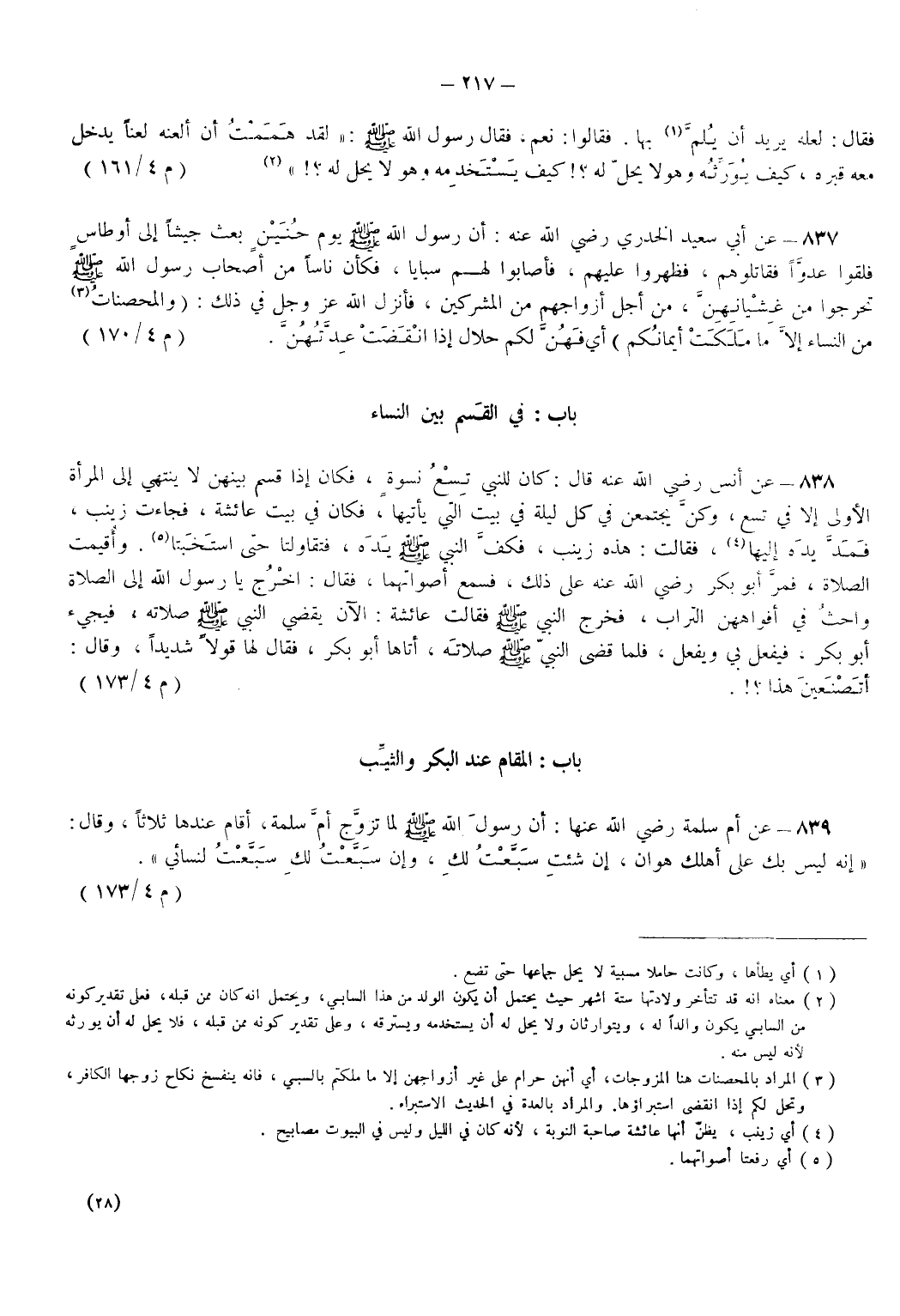 839 - عَنْ أُمِّ سَلَمَةَ - رضي الله عنها - أَنَّ رَسُولَ اللهِ - صَلَّى اللهُ عَلَيْهِ وَسَلَّمَ - لَمَّا تَزَوَّجَ أُمَّ سَلَمَةَ أَقَامَ عِنْدَهَا ثَلَاثًا وَقَالَ إِنَّهُ لَيْسَ بِكِ عَلَى أَهْلِكِ هَوَانٌ إِنْ شِئْتِ سَبَّعْتُ لَكِ وَإِنْ سَبَّعْتُ لَكِ سَبَّعْتُ لِنِسَائِي. (م 4/ 173)