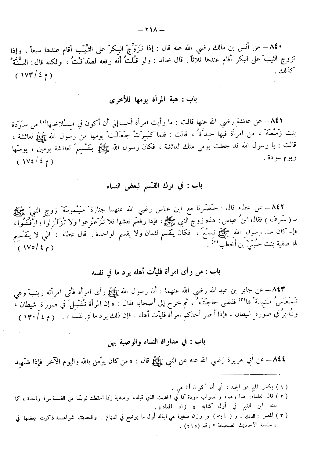 843 - عَنْ جَابِرٍ بن عبد الله - رضي الله عنهما - أَنَّ رَسُولَ اللهِ - صَلَّى اللهُ عَلَيْهِ وَسَلَّمَ - رَأَى امْرَأَةً فَأَتَى امْرَأَتَهُ زَيْنَبَ وَهِيَ تَمْعَسُ مَنِيئَةً لَهَا (¬3) فَقَضَى حَاجَتَهُ ثُمَّ خَرَجَ إِلَى أَصْحَابِهِ فَقَالَ إِنَّ الْمَرْأَةَ تُقْبِلُ في صُورَةِ شَيْطَانٍ وَتُدْبِرُ في صُورَةِ شَيْطَانٍ فَإِذَا أَبْصَرَ أَحَدُكُمْ امْرَأَةً فَلْيَأْتِ أَهْلَهُ فَإِنَّ ذَلِكَ يَرُدُّ مَا في نَفْسِهِ. (م 4/ 130)