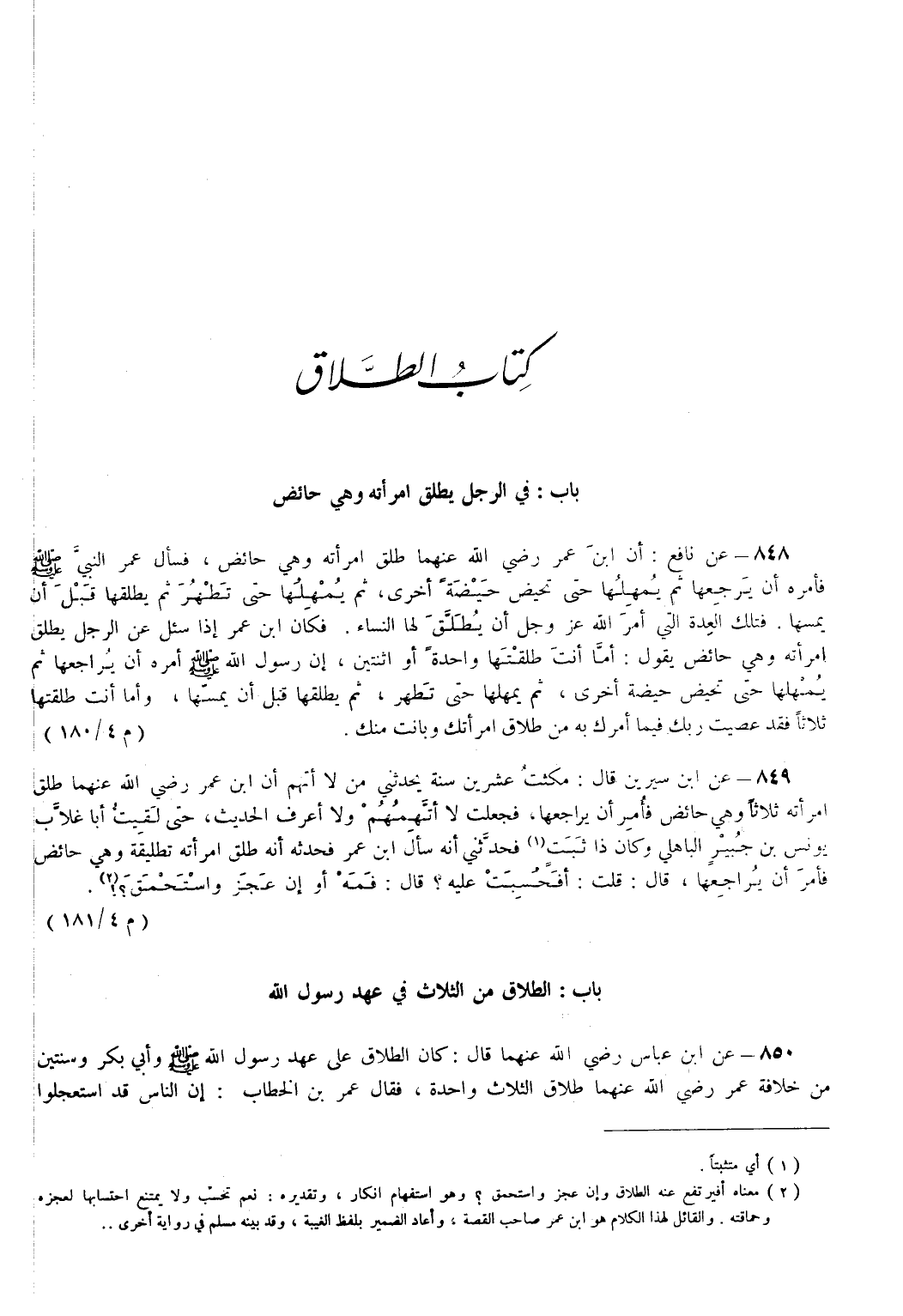 850 - عَنْ ابْنِ عَبَّاسٍ - رضي الله عنهما - قَالَ كَانَ الطَّلَاقُ عَلَى عَهْدِ رَسُولِ اللهِ - صَلَّى اللهُ عَلَيْهِ وَسَلَّمَ - وَأَبِي بَكْرٍ وَسَنَتَيْنِ مِنْ خِلَافَةِ عُمَرَ - رضي الله عنهما - طَلَاقُ الثَّلَاثِ وَاحِدَةً فَقَالَ عُمَرُ بْنُ الْخَطَّابِ إِنَّ النَّاسَ قَدْ اسْتَعْجَلُوا