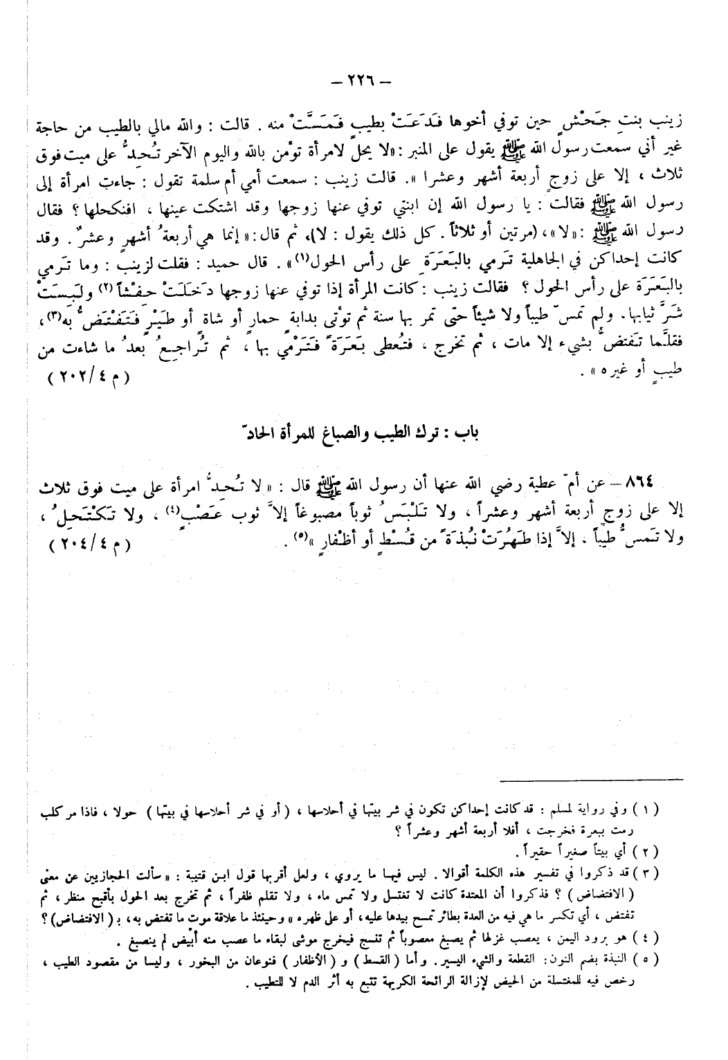864 - عَنْ أُمِّ عَطِيَّةَ - رضي الله عنها - أَنَّ رَسُولَ اللهِ - صَلَّى اللهُ عَلَيْهِ وَسَلَّمَ - قَالَ لَا تُحِدُّ امْرَأَةٌ عَلَى مَيِّتٍ فَوْقَ ثَلَاثٍ إِلَّا عَلَى زَوْجٍ أَرْبَعَةَ أَشْهُرٍ وَعَشْرًا وَلَا تَلْبَسُ ثَوْبًا مَصْبُوغًا إِلَّا ثَوْبَ عَصْبٍ (¬4) وَلَا تَكْتَحِلُ وَلَا تَمَسُّ طِيبًا إِلَّا إِذَا طَهُرَتْ نُبْذَةً مِنْ قُسْطٍ أَوْ أَظْفَارٍ (¬5). (م 4/ 204)