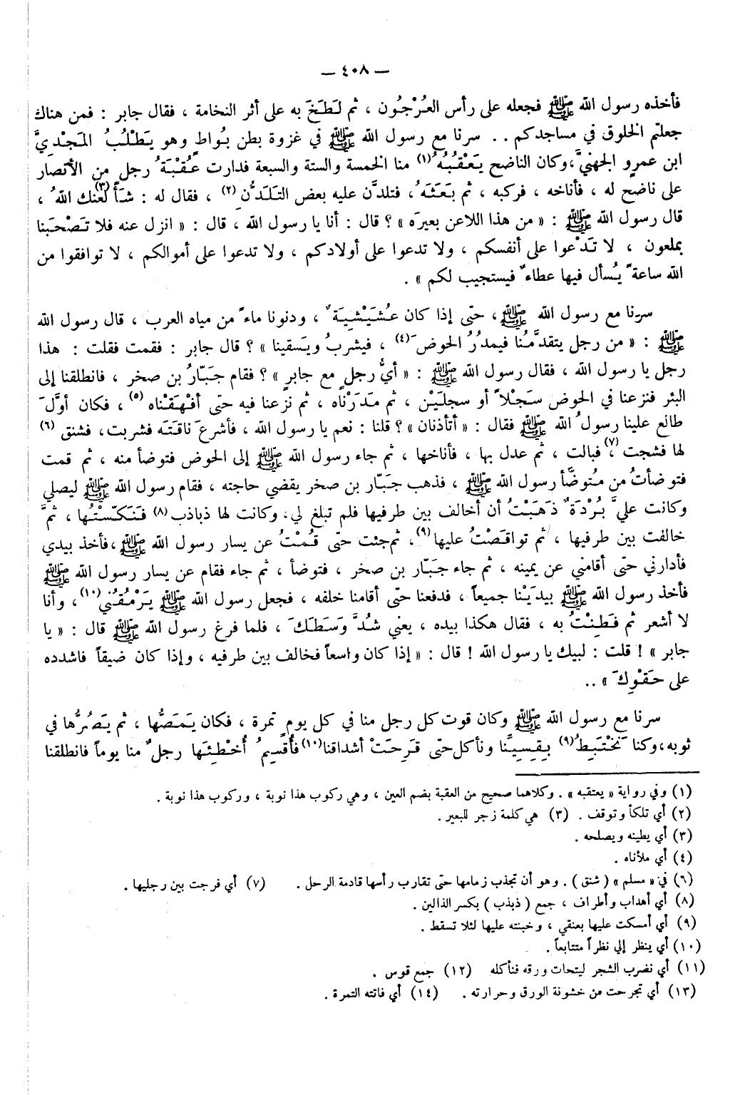 سِرْنَا مَعَ رَسُولِ اللَّهِ - صَلَّى اللَّهُ عَلَيْهِ وَسَلَّمَ - حَتَّى إِذَا كَانَتْ عُشَيْشِيَةٌ وَدَنَوْنَا مَاءً مِنْ مِيَاهِ الْعَرَبِ قَالَ رَسُولُ اللَّهِ - صَلَّى اللَّهُ عَلَيْهِ وَسَلَّمَ - مَنْ رَجُلٌ يَتَقَدَّمُنَا فَيَمْدُرُ الْحَوْضَ (¬4) فَيَشْرَبُ وَيَسْقِينَا قَالَ جَابِرٌ فَقُمْتُ فَقُلْتُ هَذَا رَجُلٌ يَا رَسُولَ اللَّهِ فَقَالَ رَسُولُ اللَّهِ - صَلَّى اللَّهُ عَلَيْهِ وَسَلَّمَ - أَيُّ رَجُلٍ مَعَ جَابِرٍ فَقَامَ جَبَّارُ بْنُ صَخْرٍ فَانْطَلَقْنَا إِلَى الْبِئْرِ فَنَزَعْنَا فِي الْحَوْضِ سَجْلًا أَوْ سَجْلَيْنِ ثُمَّ مَدَرْنَاهُ ثُمَّ نَزَعْنَا فِيهِ حَتَّى أَفْهَقْنَاهُ (¬5) فَكَانَ أَوَّلَ طَالِعٍ عَلَيْنَا رَسُولُ اللَّهِ - صَلَّى اللَّهُ عَلَيْهِ وَسَلَّمَ - فَقَالَ أَتَأْذَنَانِ قُلْنَا نَعَمْ يَا رَسُولَ اللَّهِ فَأَشْرَعَ نَاقَتَهُ فَشَرِبَتْ فشَنَقَ (¬6) لَهَا فَشَجَتْ (¬7) فَبَالَتْ ثُمَّ عَدَلَ بِهَا فَأَنَاخَهَا ثُمَّ جَاءَ رَسُولُ اللَّهِ - صَلَّى اللَّهُ عَلَيْهِ وَسَلَّمَ - إِلَى الْحَوْضِ فَتَوَضَّأَ مِنْهُ ثُمَّ قُمْتُ فَتَوَضَّأْتُ مِنْ مُتَوَضَّإِ رَسُولِ اللَّهِ - صَلَّى اللَّهُ عَلَيْهِ وَسَلَّمَ - فَذَهَبَ جَبَّارُ بْنُ صَخْرٍ يَقْضِي حَاجَتَهُ فَقَامَ رَسُولُ اللَّهِ - صَلَّى اللَّهُ عَلَيْهِ وَسَلَّمَ - لِيُصَلِّيَ وَكَانَتْ عَلَيَّ بُرْدَةٌ ذَهَبْتُ أَنْ أُخَالِفَ بَيْنَ طَرَفَيْهَا فَلَمْ تَبْلُغْ لِي وَكَانَتْ لَهَا ذَبَاذِبُ (¬8) فَنَكَّسْتُهَا ثُمَّ خَالَفْتُ بَيْنَ طَرَفَيْهَا ثُمَّ تَوَاقَصْتُ عَلَيْهَا (¬9) ثُمَّ جِئْتُ حَتَّى قُمْتُ عَنْ يَسَارِ رَسُولِ اللَّهِ - صَلَّى اللَّهُ عَلَيْهِ وَسَلَّمَ - فَأَخَذَ بِيَدِي فَأَدَارَنِي حَتَّى أَقَامَنِي عَنْ يَمِينِهِ ثُمَّ جَاءَ جَبَّارُ بْنُ صَخْرٍ فَتَوَضَّأَ ثُمَّ جَاءَ فَقَامَ عَنْ يَسَارِ رَسُولِ اللَّهِ - صَلَّى اللَّهُ عَلَيْهِ وَسَلَّمَ - فَأَخَذَ رَسُولُ اللَّهِ - صَلَّى اللَّهُ عَلَيْهِ وَسَلَّمَ - بِيَدَيْنَا جَمِيعًا فَدَفَعَنَا حَتَّى أَقَامَنَا خَلْفَهُ فَجَعَلَ رَسُولُ اللَّهِ - صَلَّى اللَّهُ عَلَيْهِ وَسَلَّمَ - يَرْمُقُنِي (¬10) وَأَنَا لَا أَشْعُرُ ثُمَّ فَطِنْتُ بِهِ فَقَالَ هَكَذَا بِيَدِهِ يَعْنِي شُدَّ وَسَطَكَ فَلَمَّا فَرَغَ رَسُولُ اللَّهِ - صَلَّى اللَّهُ عَلَيْهِ وَسَلَّمَ - قَالَ يَا جَابِرُ قُلْتُ لَبَّيْكَ يَا رَسُولَ اللَّهِ قَالَ إِذَا كَانَ وَاسِعًا فَخَالِفْ بَيْنَ طَرَفَيْهِ وَإِذَا كَانَ ضَيِّقًا فَاشْدُدْهُ عَلَى حَقْوِكَ" .. ددد مراجعة على صحة أرقام الهوامش ددد
