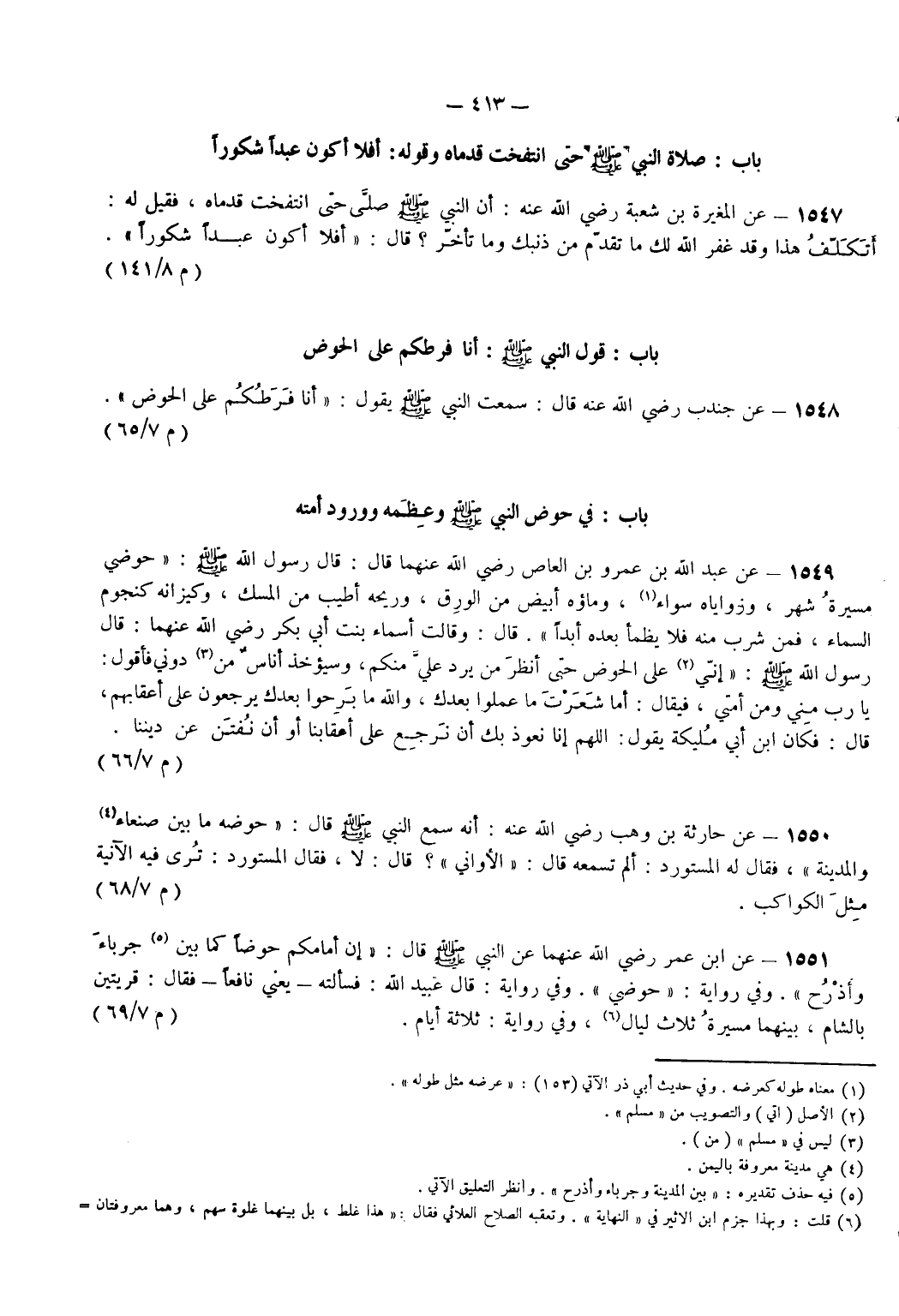 1551 - عَنْ ابْنِ عُمَرَ - رضي الله عنهما - عَنْ النَّبِيِّ - صَلَّى اللَّهُ عَلَيْهِ وَسَلَّمَ - قَالَ إِنَّ أَمَامَكُمْ حَوْضًا كَمَا بَيْنَ (¬5) جَرْبَاءَ وَأَذْرُحَ. وَفِي رِوَايَةِ: "حَوْضِي". وفي رواية: قال عُبَيْدُ اللَّهِ: فَسَأَلْتُهُ - يعني نافعاً - فَقَالَ قَرْيَتَيْنِ بِالشَّامِ بَيْنَهُمَا مَسِيرَةُ ثَلَاثِ لَيَالٍ (¬6). وَفِي رواية: ثَلَاثَةِ أَيَّامٍ. (م 7/ 69)