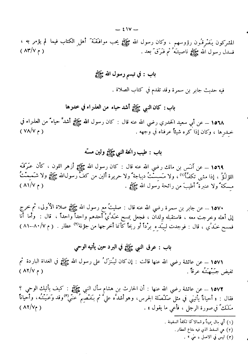 1571 - عَنْ عَائِشَةَ - رضي الله عنها - قَالَتْ إِنْ كَانَ لَيُنْزَلُ عَلَى رَسُولِ اللَّهِ - صَلَّى اللَّهُ عَلَيْهِ وَسَلَّمَ - فِي الْغَدَاةِ الْبَارِدَةِ ثُمَّ تَفِيضُ جَبْهَتُهُ عَرَقًا. (م 7/ 82)
