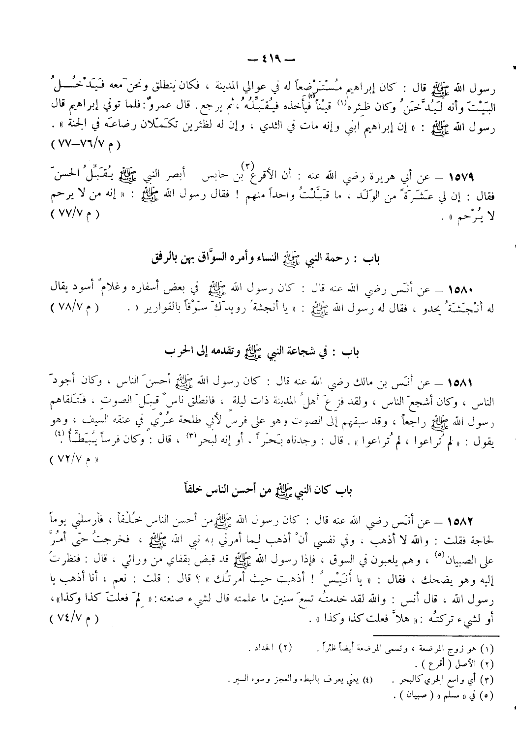 1581 - عَنْ أَنَسِ بْنِ مَالِكٍ - رضي الله عنه - قَالَ كَانَ رَسُولُ اللَّهِ - صَلَّى اللَّهُ عَلَيْهِ وَسَلَّمَ - أَحْسَنَ النَّاسِ وَكَانَ أَجْوَدَ النَّاسِ وَكَانَ أَشْجَعَ النَّاسِ وَلَقَدْ فَزِعَ أَهْلُ الْمَدِينَةِ ذَاتَ لَيْلَةٍ فَانْطَلَقَ نَاسٌ قِبَلَ الصَّوْتِ فَتَلَقَّاهُمْ رَسُولُ اللَّهِ - صَلَّى اللَّهُ عَلَيْهِ وَسَلَّمَ - رَاجِعًا وَقَدْ سَبَقَهُمْ إِلَى الصَّوْتِ وَهُوَ عَلَى فَرَسٍ لِأَبِي طَلْحَةَ عُرْيٍ فِي عُنُقِهِ السَّيْفُ وَهُوَ يَقُولُ لَمْ تُرَاعُوا لَمْ تُرَاعُوا قَالَ وَجَدْنَاهُ بَحْرًا أَوْ إِنَّهُ لَبَحْرٌ (¬4) قَالَ وَكَانَ فَرَسًا يُبَطَّأُ (¬5). (م 7/ 72)