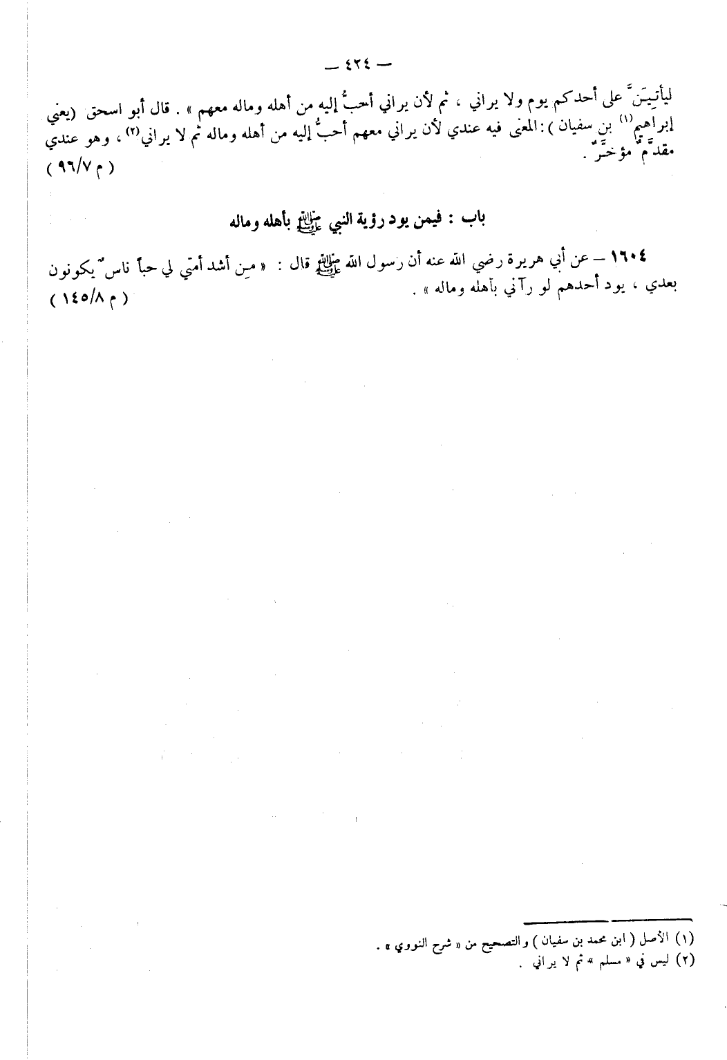 1604 - عَنْ أَبِي هُرَيْرَةَ - رضي الله عنه - أَنَّ رَسُولَ اللَّهِ - صَلَّى اللَّهُ عَلَيْهِ وَسَلَّمَ - قَالَ مِنْ أَشَدِّ أُمَّتِي لِي حُبًّا نَاسٌ يَكُونُونَ بَعْدِي يَوَدُّ أَحَدُهُمْ لَوْ رَآنِي بِأَهْلِهِ وَمَالِهِ. (م 8/ 145)