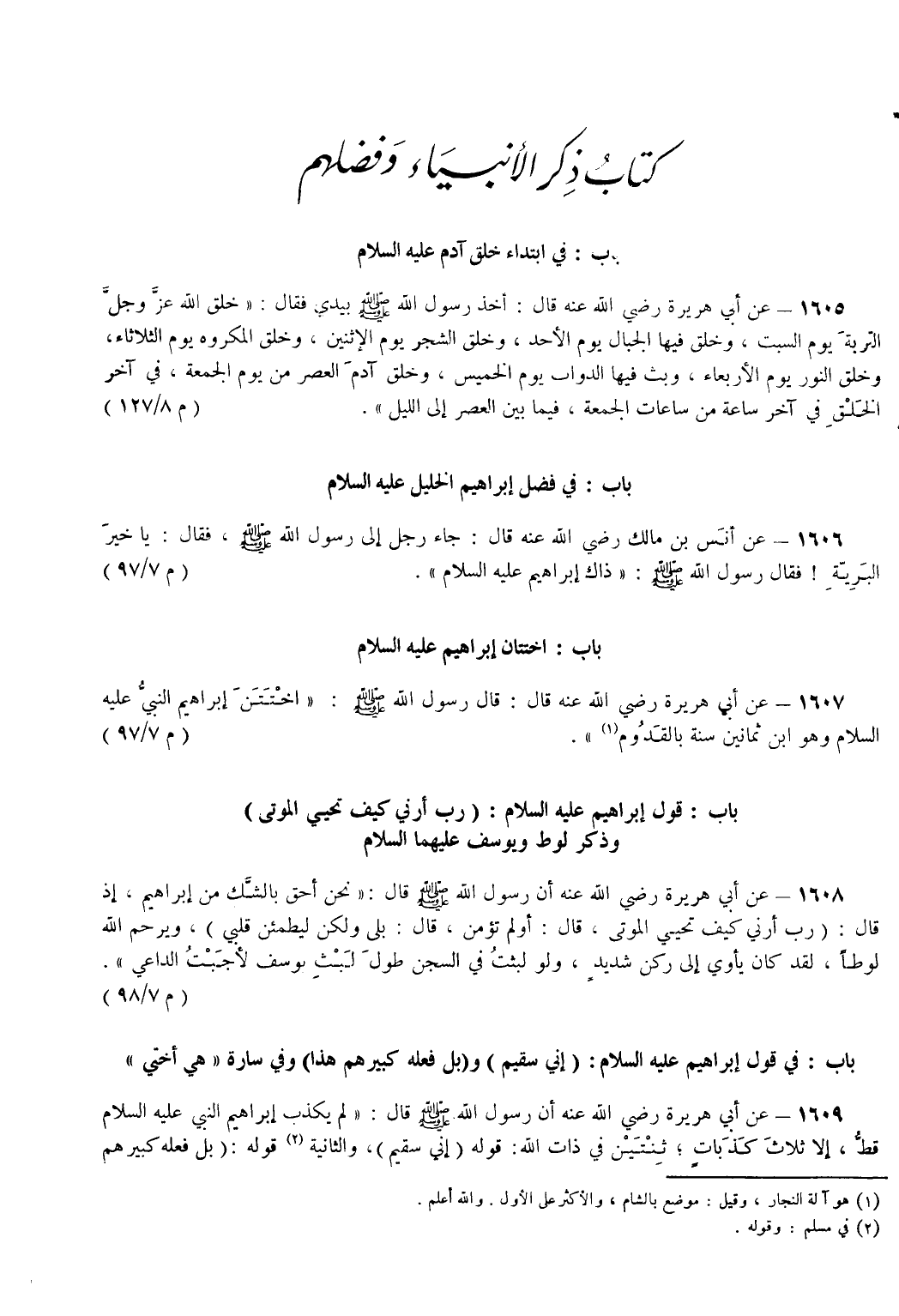 1607 - عَنْ أَبِي هُرَيْرَةَ - رضي الله عنه - قَالَ قَالَ رَسُولُ اللَّهِ - صَلَّى اللَّهُ عَلَيْهِ وَسَلَّمَ - اخْتَتَنَ إِبْرَاهِيمُ النَّبِيُّ عَلَيْهِ السَّلَام وَهُوَ ابْنُ ثَمَانِينَ سَنَةً بِالْقَدُومِ (¬1). (م 7/ 97)
