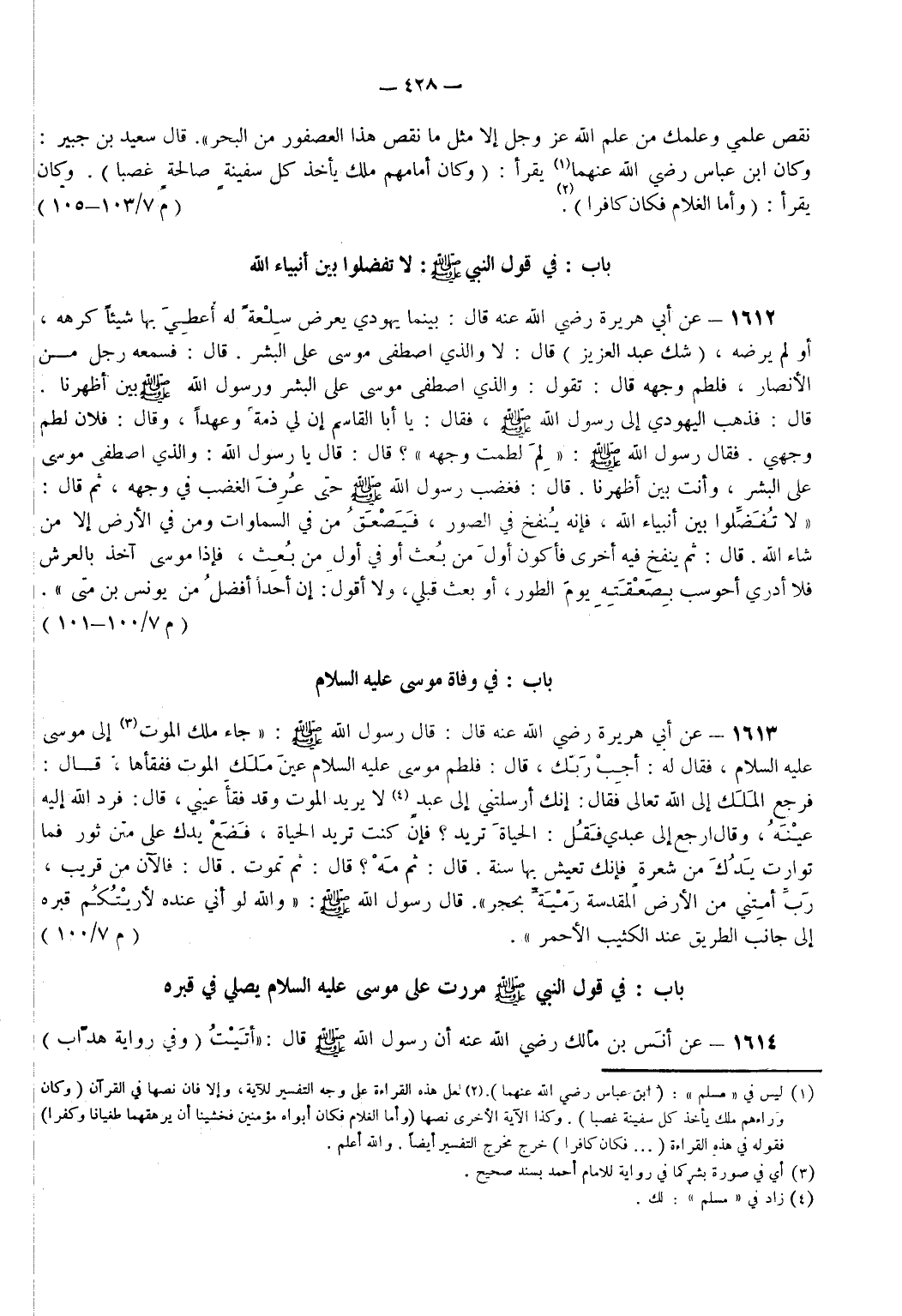 1612 - عَنْ أَبِي هُرَيْرَةَ - رضي الله عنه - قَالَ بَيْنَمَا يَهُودِيٌّ يَعْرِضُ سِلْعَةً لَهُ أُعْطِيَ بِهَا شَيْئًا كَرِهَهُ أَوْ لَمْ يَرْضَهُ شَكَّ عَبْدُ الْعَزِيزِ قَالَ لَا وَالَّذِي اصْطَفَى مُوسَى عَلَى الْبَشَرِ قَالَ فَسَمِعَهُ رَجُلٌ مِنْ الْأَنْصَارِ فَلَطَمَ وَجْهَهُ قَالَ تَقُولُ وَالَّذِي اصْطَفَى مُوسَى عَلَى الْبَشَرِ وَرَسُولُ اللَّهِ - صَلَّى اللَّهُ عَلَيْهِ وَسَلَّمَ - بَيْنَ أَظْهُرِنَا قَالَ فَذَهَبَ الْيَهُودِيُّ إِلَى رَسُولِ اللَّهِ - صَلَّى اللَّهُ عَلَيْهِ وَسَلَّمَ - فَقَالَ يَا أَبَا الْقَاسِمِ إِنَّ لِي ذِمَّةً وَعَهْدًا وَقَالَ فُلَانٌ لَطَمَ وَجْهِي فَقَالَ رَسُولُ اللَّهِ - صَلَّى اللَّهُ عَلَيْهِ وَسَلَّمَ - لِمَ لَطَمْتَ وَجْهَهُ قَالَ قَالَ يَا رَسُولَ اللَّهِ وَالَّذِي اصْطَفَى مُوسَى عَلَى الْبَشَرِ وَأَنْتَ بَيْنَ أَظْهُرِنَا قَالَ فَغَضِبَ رَسُولُ اللَّهِ - صَلَّى اللَّهُ عَلَيْهِ وَسَلَّمَ - حَتَّى عُرِفَ الْغَضَبُ فِي وَجْهِهِ ثُمَّ قَالَ لَا تُفَضِّلُوا بَيْنَ أَنْبِيَاءِ اللَّهِ فَإِنَّهُ يُنْفَخُ فِي الصُّورِ فَيَصْعَقُ مَنْ فِي السَّمَاوَاتِ وَمَنْ فِي الْأَرْضِ إِلَّا مَنْ شَاءَ اللَّهُ قَالَ ثُمَّ يُنْفَخُ فِيهِ أُخْرَى فَأَكُونُ أَوَّلَ مَنْ بُعِثَ أَوْ فِي أَوَّلِ مَنْ بُعِثَ فَإِذَا مُوسَى آخِذٌ بِالْعَرْشِ فَلَا أَدْرِي أَحُوسِبَ بِصَعْقَتِهِ يَوْمَ الطُّورِ أَوْ بُعِثَ قَبْلِي وَلَا أَقُولُ إِنَّ أَحَدًا أَفْضَلُ مِنْ يُونُسَ بْنِ مَتَّى عَلَيْهِ السَّلَام. (م 7/ 100 - 101)