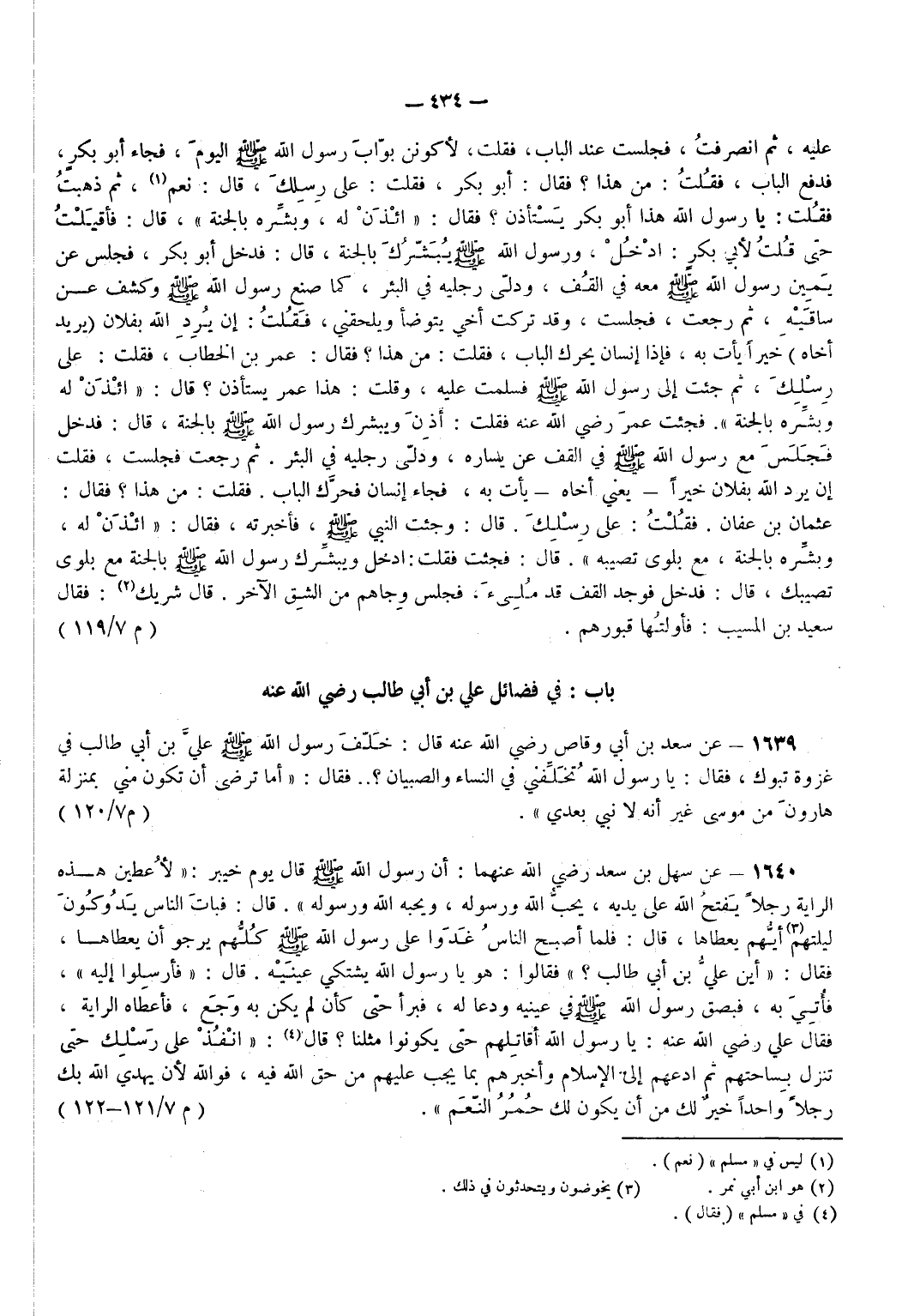 1639 - عَنْ سَعْدِ بْنِ أَبِي وَقَّاصٍ - رضي الله عنه - قَالَ خَلَّفَ رَسُولُ اللَّهِ - صَلَّى اللَّهُ عَلَيْهِ وَسَلَّمَ - عَلِيَّ بْنَ أَبِي طَالِبٍ فِي غَزْوَةِ تَبُوكَ فَقَالَ يَا رَسُولَ اللَّهِ تُخَلِّفُنِي فِي النِّسَاءِ وَالصِّبْيَانِ فَقَالَ أَمَا تَرْضَى أَنْ تَكُونَ مِنِّي بِمَنْزِلَةِ هَارُونَ مِنْ مُوسَى غَيْرَ أَنَّهُ لَا نَبِيَّ بَعْدِي. (م 7/ 120)