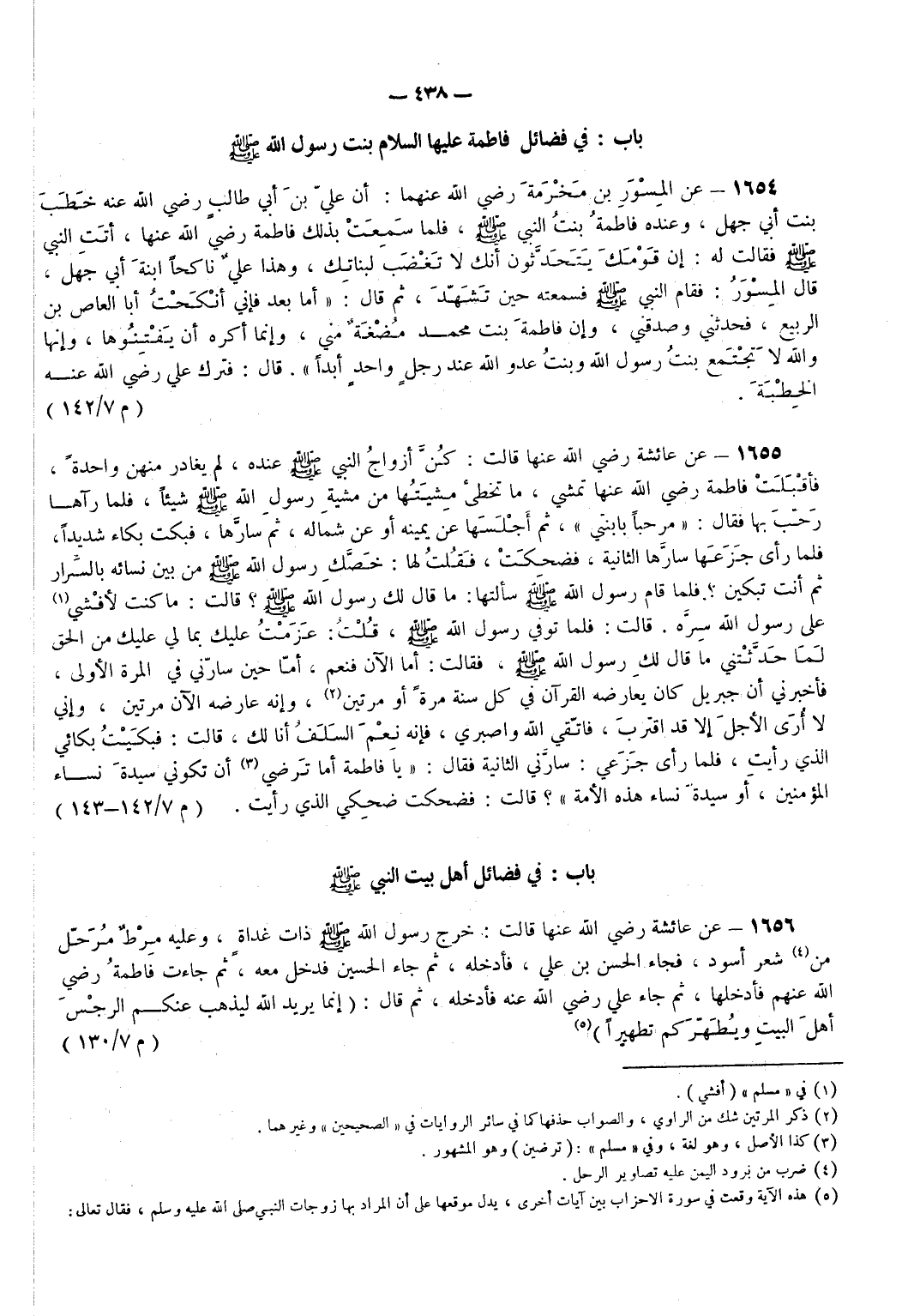 1656 - عن عَائِشَة - رضي الله عنها - قالت خَرَجَ رسول الله - صَلَّى اللَّهُ عَلَيْهِ وَسَلَّمَ - غَدَاةً وَعَلَيْهِ مِرْطٌ مُرَحَّلٌ مِنْ (¬4) شَعْرٍ أَسْوَدَ فَجَاءَ الْحَسَنُ بْنُ عَلِيٍّ فَأَدْخَلَهُ ثُمَّ جَاءَ الْحُسَيْنُ فَدَخَلَ مَعَهُ ثُمَّ جَاءَتْ فَاطِمَةُ - رضي الله عنهم - فَأَدْخَلَهَا ثُمَّ جَاءَ عَلِيٌّ - رضي الله عنه - فَأَدْخَلَهُ ثُمَّ قَالَ (إِنَّمَا يُرِيدُ اللَّهُ لِيُذْهِبَ عَنْكُمْ الرِّجْسَ أَهْلَ الْبَيْتِ وَيُطَهِّرَكُمْ تَطْهِيرًا) (¬5). (م 7/ 130)