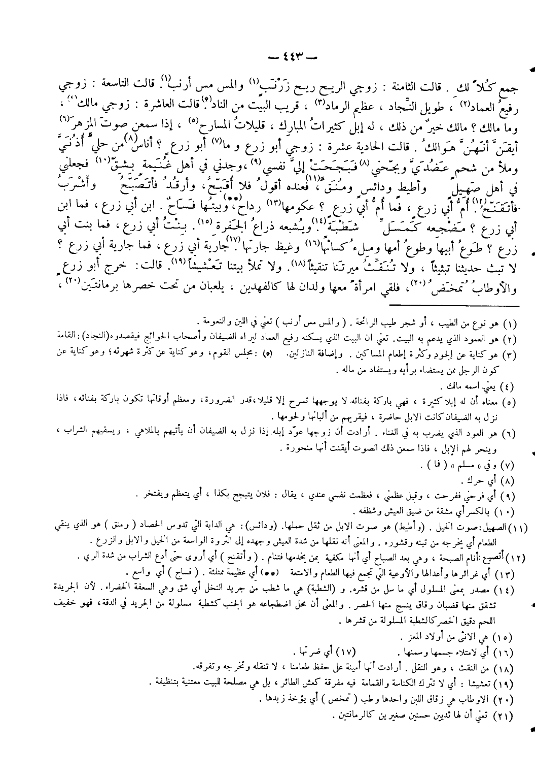 جَمَعَ كُلًّا لَكِ قَالَتْ الثَّامِنَةُ زَوْجِي الرِّيحُ رِيحُ زَرْنَبٍ (¬1) وَالْمَسُّ مَسُّ أَرْنَبٍ (1) قَالَتْ التَّاسِعَةُ زَوْجِي رَفِيعُ الْعِمَادِ (¬2) طَوِيلُ النِّجَادِ عَظِيمُ الرَّمَادِ (¬3) قَرِيبُ الْبَيْتِ مِنْ النَّادِ (*) قَالَتْ الْعَاشِرَةُ زَوْجِي مَالِكٌ (¬4) وَمَا مَالِكٌ مَالِكٌ خَيْرٌ مِنْ ذَلِكَ لَهُ إِبِلٌ كَثِيرَاتُ الْمَبَارِكِ قَلِيلَاتُ الْمَسَارِحِ (¬5) إِذَا سَمِعْنَ صَوْتَ الْمِزْهَرِ (¬6) أَيْقَنَّ أَنَّهُنَّ هَوَالِكُ قَالَتْ الْحَادِيَةَ عَشْرَةَ زَوْجِي أَبُو زَرْعٍ ومَا (¬7) أَبُو زَرْعٍ أَنَاسَ (8) مِنْ حُلِيٍّ أُذُنَيَّ وَمَلَأَ مِنْ شَحْمٍ عَضُدَيَّ وَبَجَّحَنِي (¬8) فَبَجَحَتْ إِلَيَّ نَفْسِي (¬9) وَجَدَنِي فِي أَهْلِ غُنَيْمَةٍ بِشِقٍّ (¬10) فَجَعَلَنِي فِي أَهْلِ صَهِيلٍ وَأَطِيطٍ وَدَائِسٍ وَمُنَقٍّ (¬11) فَعِنْدَهُ أَقُولُ فَلَا أُقَبَّحُ وَأَرْقُدُ فَأَتَصَبَّحُ وَأَشْرَبُ فَأَتَقَنَّحُ (¬12) أُمُّ أَبِي زَرْعٍ فَمَا أُمُّ أَبِي زَرْعٍ عُكُومُهَا (¬13) رَدَاحٌ (**) وَبَيْتُهَا فَسَاحٌ ابْنُ أَبِي زَرْعٍ فَمَا ابْنُ أَبِي زَرْعٍ مَضْجَعُهُ كَمَسَلِّ شَطْبَةٍ (¬14) وَيُشْبِعُهُ ذِرَاعُ الْجَفْرَةِ (¬15) بِنْتُ أَبِي زَرْعٍ فَمَا بِنْتُ أَبِي زَرْعٍ طَوْعُ أَبِيهَا وَطَوْعُ أُمِّهَا وَمِلْءُ كِسَائِهَا (¬16) وَغَيْظُ جَارَتِهَا (¬17) جَارِيَةُ أَبِي زَرْعٍ فَمَا جَارِيَةُ أَبِي زَرْعٍ لَا تَبُثُّ حَدِيثَنَا تَبْثِيثًا وَلَا تُنَقِّثُ مِيرَتَنَا تَنْقِيثًا (¬18) وَلَا تَمْلَأُ بَيْتَنَا تَعْشِيشًا (¬19) قَالَتْ خَرَجَ أَبُو زَرْعٍ وَالْأَوْطَابُ تُمْخَضُ (¬20) فَلَقِيَ امْرَأَةً مَعَهَا وَلَدَانِ لَهَا كَالْفَهْدَيْنِ يَلْعَبَانِ مِنْ تَحْتِ خَصْرِهَا بِرُمَّانَتَيْنِ (¬21)
