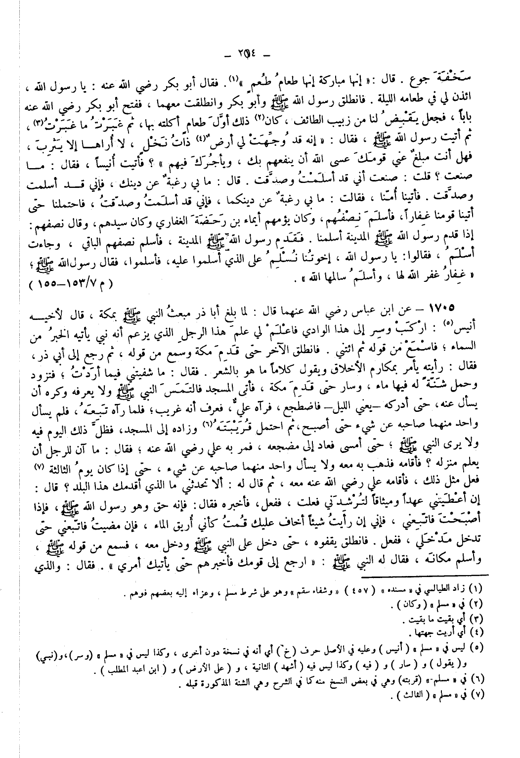 1705 - عَنْ ابْنِ عَبَّاسٍ - رضي الله عنهما - قَالَ لَمَّا بَلَغَ أَبَا ذَرٍّ مَبْعَثُ النَّبِيِّ - صَلَّى اللَّهُ عَلَيْهِ وَسَلَّمَ - بِمَكَّةَ قَالَ لِأَخِيهِ أنيس (¬5) ارْكَبْ وسر إِلَى هَذَا الْوَادِي فَاعْلَمْ لِي عِلْمَ هَذَا الرَّجُلِ الَّذِي يَزْعُمُ أَنَّهُ نبي يَأْتِيهِ الْخَبَرُ مِنْ السَّمَاءِ فَاسْمَعْ مِنْ قَوْلِهِ ثُمَّ ائْتِنِي فَانْطَلَقَ الْآخَرُ حَتَّى قَدِمَ مَكَّةَ وَسَمِعَ مِنْ قَوْلِهِ ثُمَّ رَجَعَ إِلَى أَبِي ذَرٍّ فَقَالَ رَأَيْتُهُ يَأْمُرُ بِمَكَارِمِ الْأَخْلَاقِ وَيقول كَلَامًا مَا هُوَ بِالشِّعْرِ فَقَالَ مَا شَفَيْتَنِي فِيمَا أَرَدْتُ فَتَزَوَّدَ وَحَمَلَ شَنَّةً لَهُ فِيهَا مَاءٌ وسار حَتَّى قَدِمَ مَكَّةَ فَأَتَى الْمَسْجِدَ فَالْتَمَسَ النَّبِيَّ - صَلَّى اللَّهُ عَلَيْهِ وَسَلَّمَ - وَلَا يَعْرِفُهُ وَكَرِهَ أَنْ يَسْأَلَ عَنْهُ حَتَّى أَدْرَكَهُ يَعْنِي اللَّيْلَ فَاضْطَجَعَ فَرَآهُ عَلِيٌّ فَعَرَفَ أَنَّهُ غَرِيبٌ فَلَمَّا رَآهُ تَبِعَهُ فَلَمْ يَسْأَلْ وَاحِدٌ مِنْهُمَا صَاحِبَهُ عَنْ شَيْءٍ حَتَّى أَصْبَحَ ثُمَّ احْتَمَلَ قِرْيبَتَهُ (¬6) وَزَادَهُ إِلَى الْمَسْجِدِ فَظَلَّ ذَلِكَ الْيَوْمَ فيه وَلَا يَرَى النَّبِيَّ - صَلَّى اللَّهُ عَلَيْهِ وَسَلَّمَ - حَتَّى أَمْسَى فَعَادَ إِلَى مَضْجَعِهِ فَمَرَّ بِهِ عَلِيٌّ - رضي الله عنه - فَقَالَ مَا أَنَى لِلرَّجُلِ أَنْ يَعْلَمَ مَنْزِلَهُ فَأَقَامَهُ فَذَهَبَ بِهِ مَعَهُ وَلَا يَسْأَلُ وَاحِدٌ مِنْهُمَا صَاحِبَهُ عَنْ شَيْءٍ حَتَّى إِذَا كَانَ يَوْمُ الثَّالِثة (¬7) فَعَلَ مِثْلَ ذَلِكَ فَأَقَامَهُ عَلِيٌّ - رضي الله عنه - مَعَهُ ثُمَّ قَالَ لَهُ أَلَا تُحَدِّثُنِي مَا الَّذِي أَقْدَمَكَ هَذَا الْبَلَدَ قَالَ إِنْ أَعْطَيْتَنِي عَهْدًا وَمِيثَاقًا لَتُرْشِدَنِّي فَعَلْتُ فَفَعَلَ فَأَخْبَرَهُ فَقَالَ فَإِنَّهُ حَقٌّ وَهُوَ رَسُولُ اللَّهِ - صَلَّى اللَّهُ عَلَيْهِ وَسَلَّمَ - فَإِذَا أَصْبَحْتَ فَاتَّبِعْنِي فَإِنِّي إِنْ رَأَيْتُ شَيْئًا أَخَافُ عَلَيْكَ قُمْتُ كَأَنِّي أُرِيقُ الْمَاءَ فَإِنْ مَضَيْتُ فَاتَّبِعْنِي حَتَّى تَدْخُلَ مَدْخَلِي فَفَعَلَ فَانْطَلَقَ يَقْفُوهُ حَتَّى دَخَلَ عَلَى النَّبِيِّ - صَلَّى اللَّهُ عَلَيْهِ وَسَلَّمَ - وَدَخَلَ مَعَهُ فَسَمِعَ مِنْ قَوْلِهِ وَأَسْلَمَ مَكَانَهُ فَقَالَ لَهُ النَّبِيُّ - صَلَّى اللَّهُ عَلَيْهِ وَسَلَّمَ - ارْجِعْ إِلَى قَوْمِكَ فَأَخْبِرْهُمْ حَتَّى يَأْتِيَكَ أَمْرِي فَقَالَ وَالَّذِي