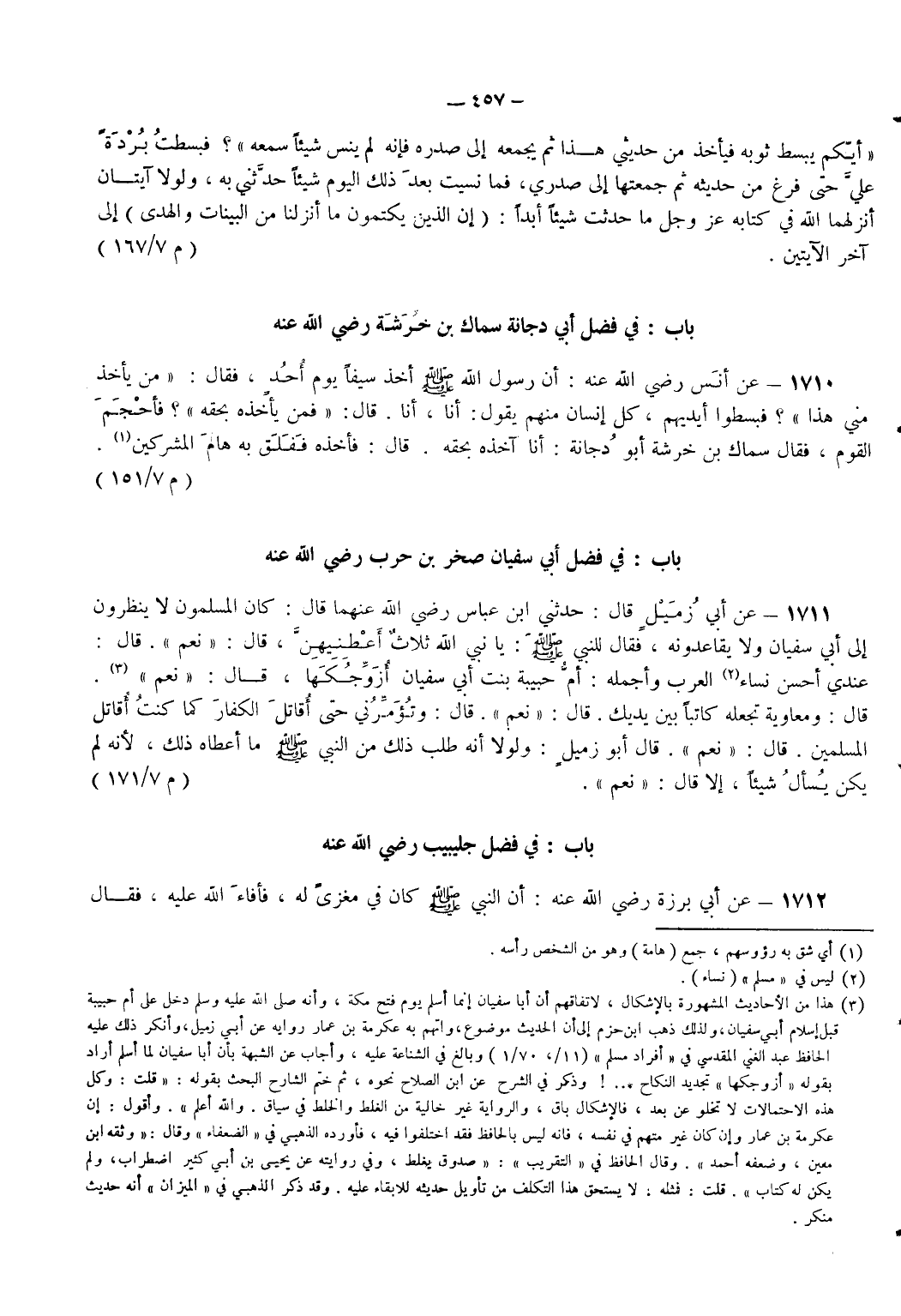 (¬3) هذا من الأحاديث المشهورة بالإشكال، لاتفاقهم أن أبا سفيان إنما أسلم يوم فتح مكة، وأنه صلى الله عليه وسلم دخل على أم حبيبة قبل إسلام أبي سفيان، ولذلك ذهب ابن حزم إلى أن الحديث موضوع، واتهم به عكرمة بن عمار روايه عن أبي زميل، وأنكر ذلك عليه الحافظ عبد الغني المقدسي في "أفراد مسلم" (11 /، 1/ 70) وبالغ في الشناعة عليه، وأجاب عن الشبهة بأن أبا سفيان لما أسلم أراد بقوله "أزوجكها" تجديد النكاح ... ! وذكر في الشرح عن ابن الصلاح نحوه، ثم ختم الشارح البحث بقوله: "قلت: وكل هذه الاحتمالات لا تخلو عن بعد، فالإشكال باق، والرواية غير خالية من الغلط والخلط في سياق. والله أعلم". وأقول: إن عكرمة بن عمار وإن كان غير متهم في نفسه، فإنه ليس بالحافظ فقد اختلفوا فيه، فأورده الذهبي في "الضعفاء" وقال: "وثقه ابن معين، وضعفه أحمد". وقال الحافظ في "التقريب": "صدوق يغلط، وفي رواية عن يحيى بن أبي كثير اضطراب، ولم يكن له كتاب". قلت: فمثله: لا يستحق هذا التكلف من تأويل حديثه للإبقاء عليه. وقد ذكر الذهبي في "الميزان" أنه حديث منكر.