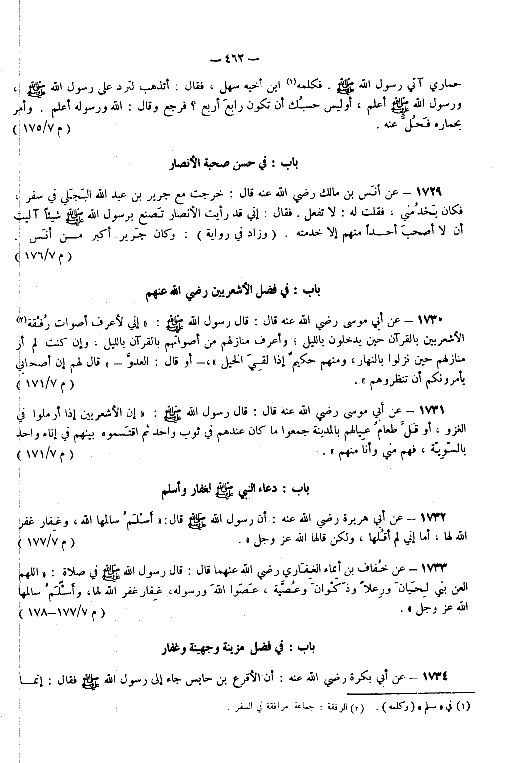 1729 - عَنْ أَنَسِ بْنِ مَالِكٍ - رضي الله عنه - قَالَ خَرَجْتُ مَعَ جَرِيرِ بْنِ عَبْدِ اللَّهِ الْبَجَلِيِّ فِي سَفَرٍ فَكَانَ يَخْدُمُنِي فَقُلْتُ لَهُ لَا تَفْعَلْ فَقَالَ إِنِّي قَدْ رَأَيْتُ الْأَنْصَارَ تَصْنَعُ بِرَسُولِ اللَّهِ - صَلَّى اللَّهُ عَلَيْهِ وَسَلَّمَ - شَيْئًا آلَيْتُ أَنْ لَا أَصْحَبَ أَحَدًا مِنْهُمْ إِلَّا خَدَمْتُهُ. (وزَادَ فِي رواية:) وَكَانَ جَرِيرٌ أَكْبَرَ مِنْ أَنَسٍ. (م 7/ 176)