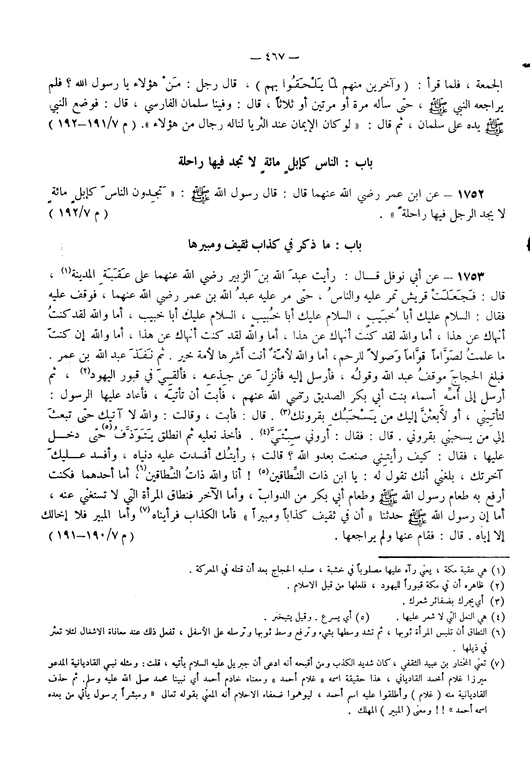 (¬7) تعني المختار بن عبيد الثقفي، كان شديد الكذب ومن أقبحه أنه ادعى أن جبريل عليه السلام يأتيه، قلت: ومثله نبي القاديانية المدعو ميرزا غلام أحمد القادياني، هذا حقيقة اسمه "غلام أحمد" ومعناه خادم أحمد أي نبينا محمد صلى الله عليه وسلم. ثم حذف القاديانية منه (غلام) وأطلقوا عليه اسم أحمد، ليوهموا ضعفاء الأحلام أنه المعني بقوله تعالى "ومبشراً برسول يأتي من بعدي اسمه أحمد"!! ومعنى (المبير) المهلك.
